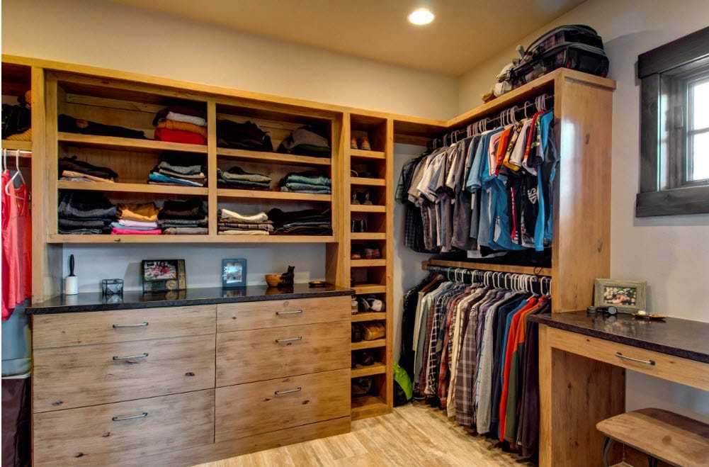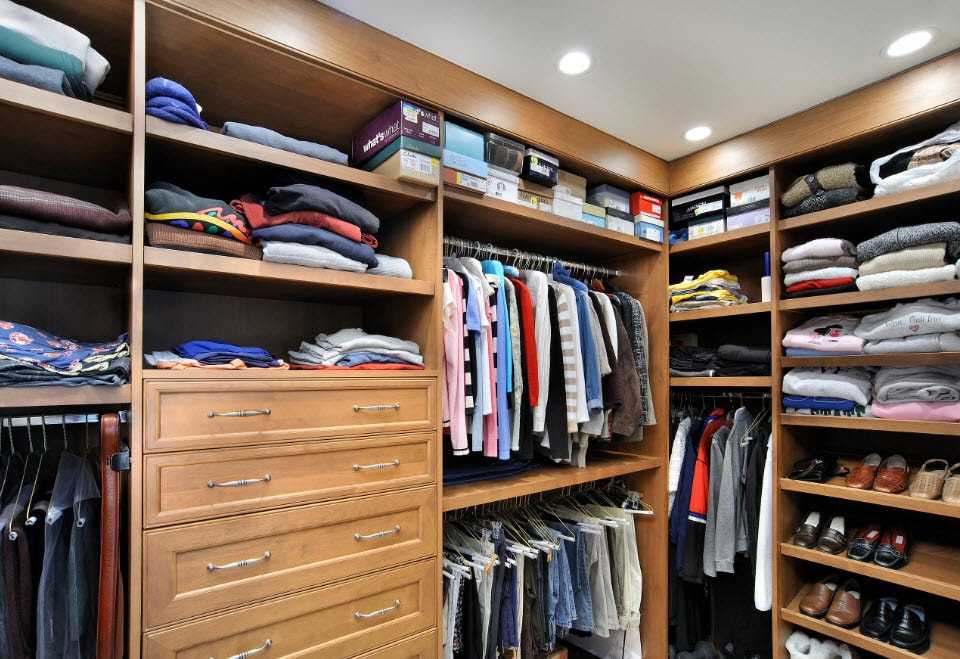 Самые большие отсеки занимает одежда, висящая на штангах (ригелях). Если в спальне предполагается хранение пальто и курток, лучше всего выделить для них отдельный сектор. То же касается обуви; для неё отводится нижняя часть шкафа. Полки используются для трикотажа, постельного белья, а также коробок или корзин, где можно хранить полотенца.