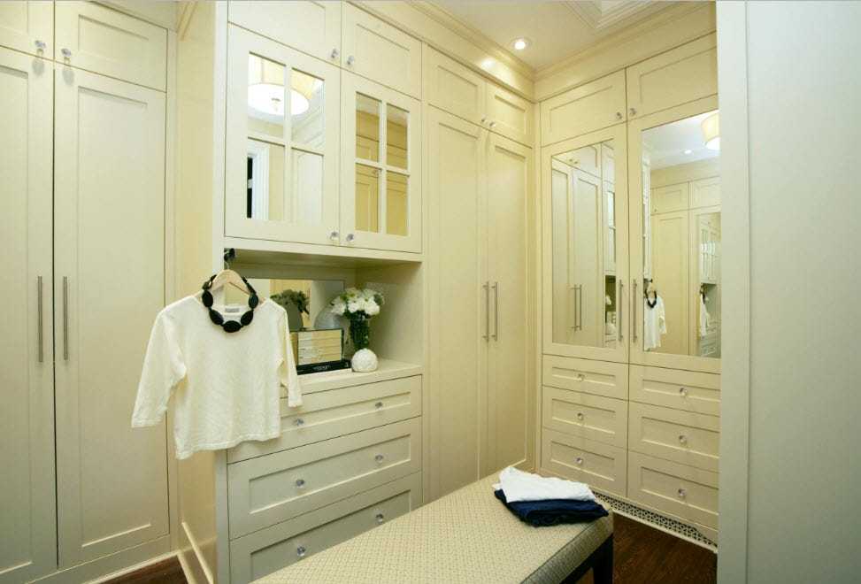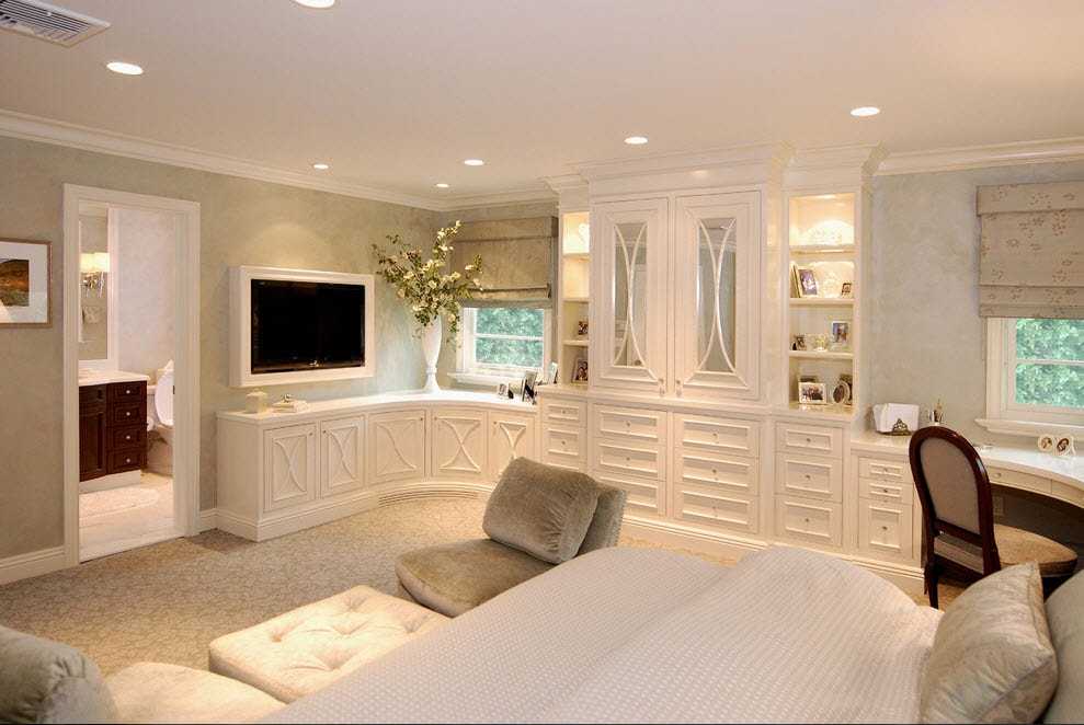 Если нет возможности установить в спальне туалетный столик, рекомендуется оснастить шкаф-купе специальной секцией для личных вещей. Играя роль кладовой, он также должен включать в себя удобные отделы для сумок, обуви и прочего имущества.