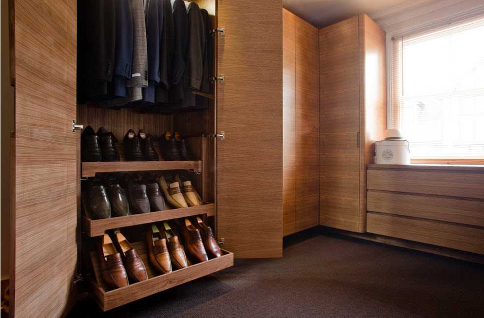 На фото неглубокий угловой шкаф-купе с нижними и верхними штангами, а также выкатными ящичками для мелочей.