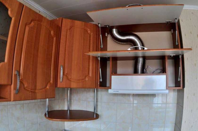 Для монтажа такой конструкции в доме необходимы определенные профессиональные навыки. Для ее размещения нужен шкаф, который устанавливают на требуемом расстоянии над плитой. Можно отвести под вытяжное оборудование уже имеющуюся мебель или изготовить шкафчик индивидуально.