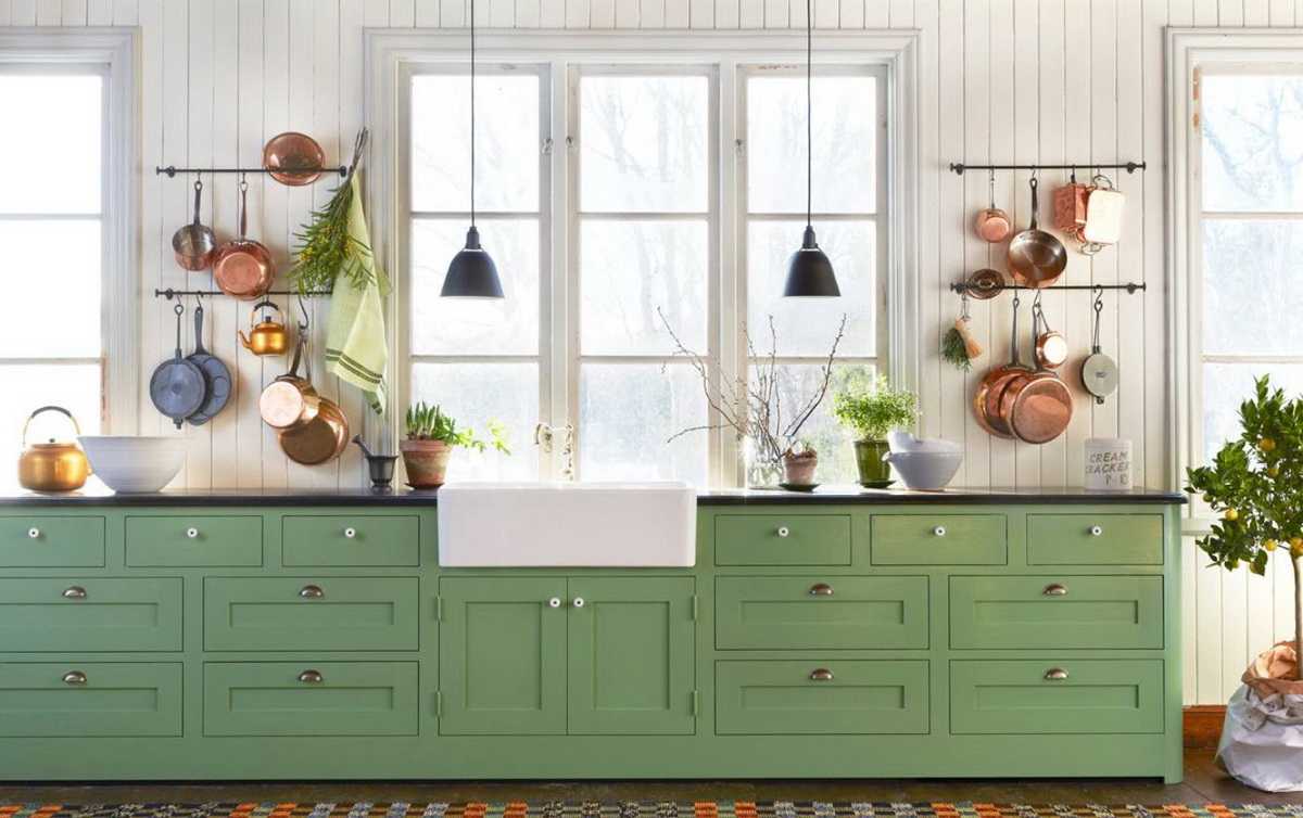 Неплохо мебель зеленого цвета в скандинавском стиле будет сочетаться с медными и золотыми оттенками.