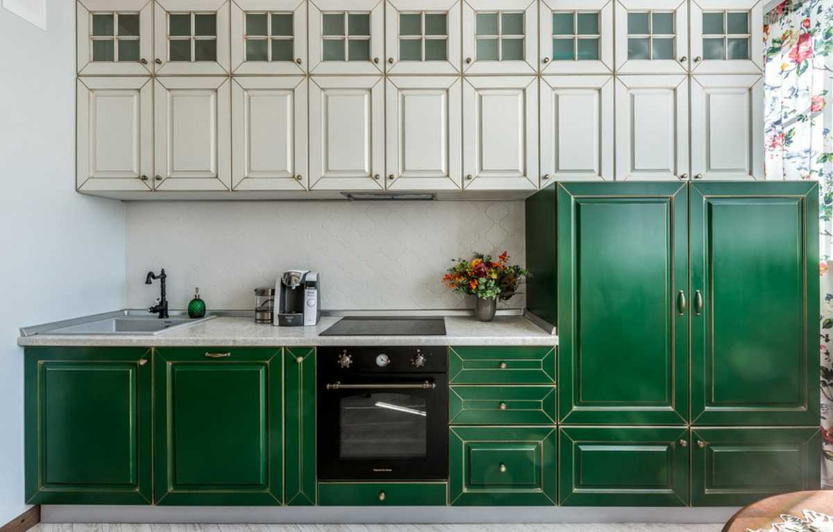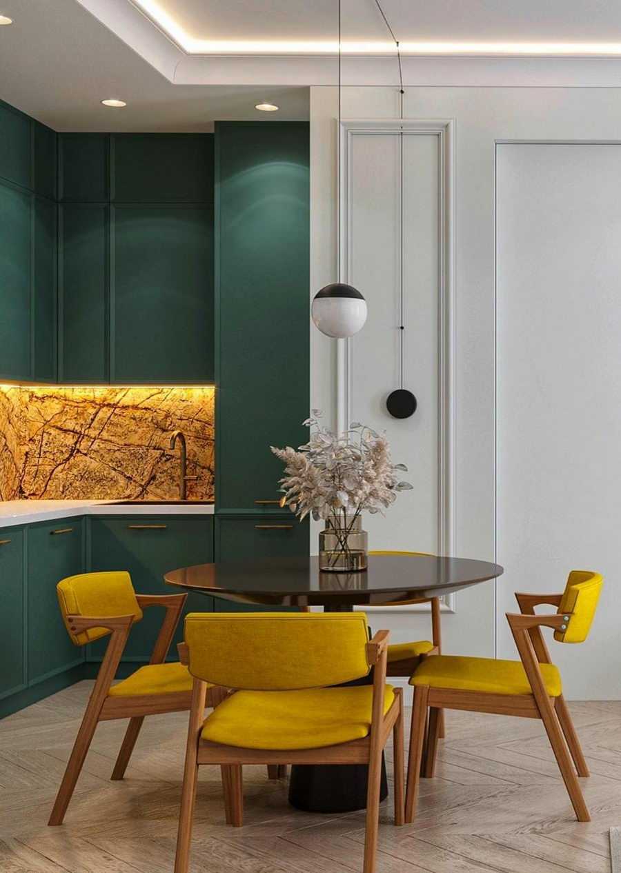 Этот тон хорошо сочетается с золотом, что можно выгодно обыграть с помощью техники, элементов декора и отделки. Единственный нюанс – обилие изумрудного не подойдет для очень маленькой кухни. Этому цвету нужен простор, чтобы не выглядеть «тяжелым» и мрачным.