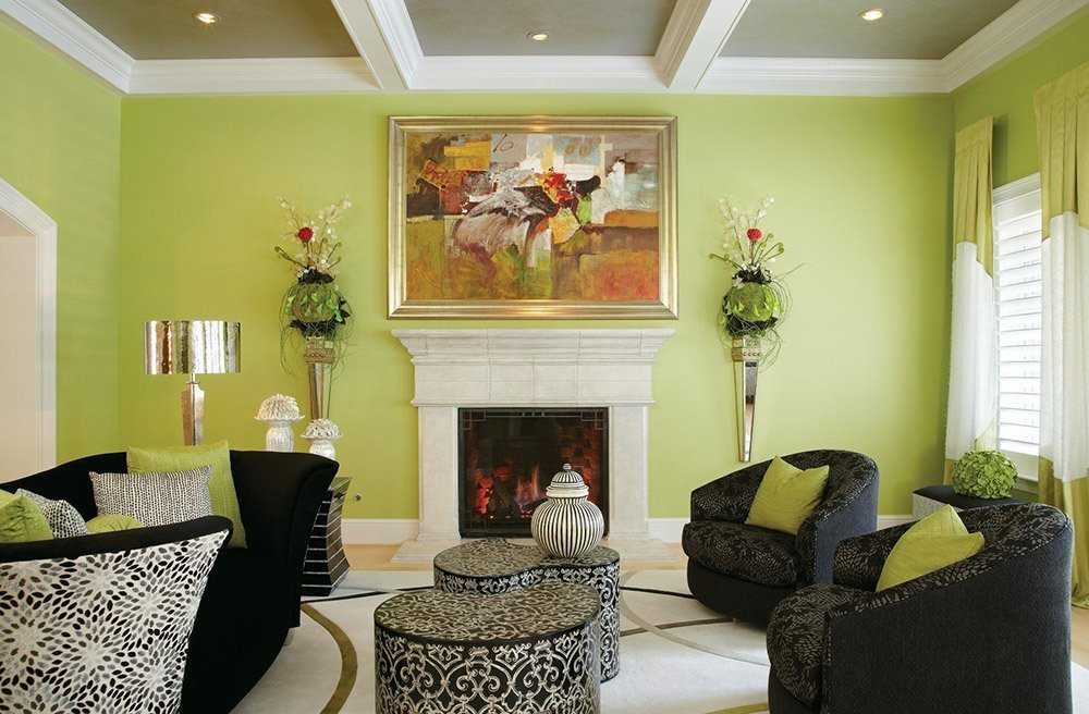 Когда говорят о цвете лица, то зеленый это признак болезни, но для интерьера он может стать глотком свежести и гармонии. Однако требуется чувство меры при применение желтого с зеленоватым в интерьерном оформлении. Если покрытие стен и потолка кажется излишним, то можно разбавить общий фон, используя расставление отдельных акцентов по комнате.