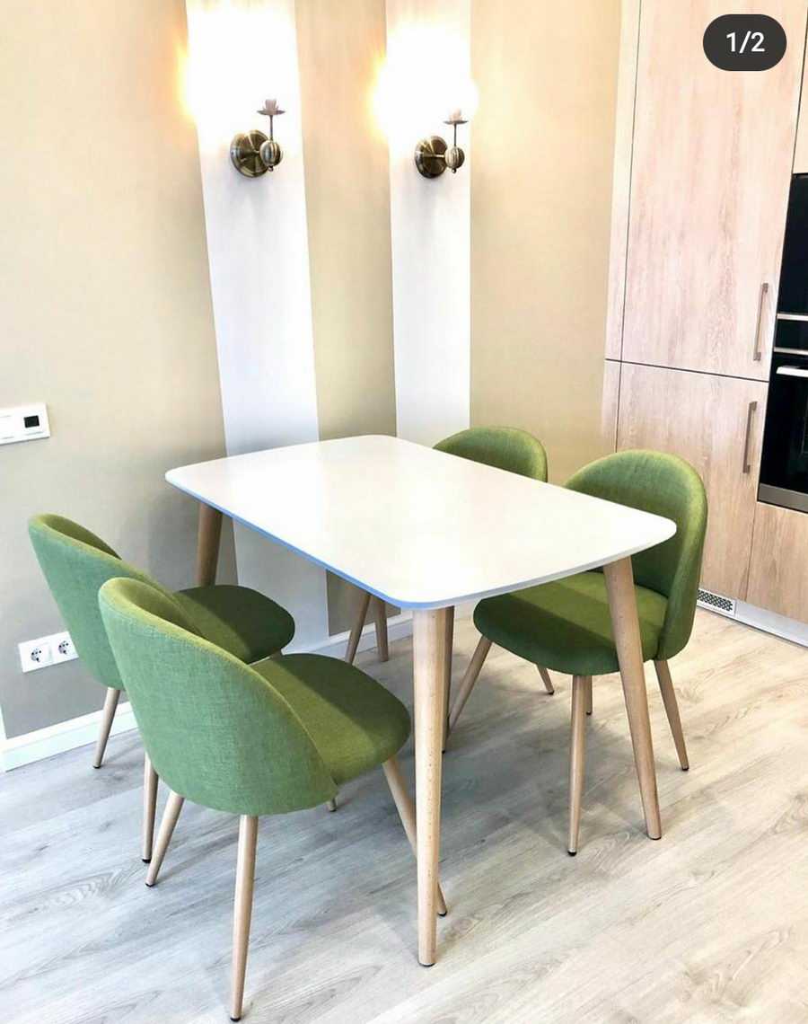 Спинки и сиденья стульев можно выполнить в контрастном оттенке по отношению к зеленому цвету гарнитура, например, в светло-фиолетовом или оранжевом тоне. Изысканным сочетанием со светло-мраморным столом станут бордовые кресла.