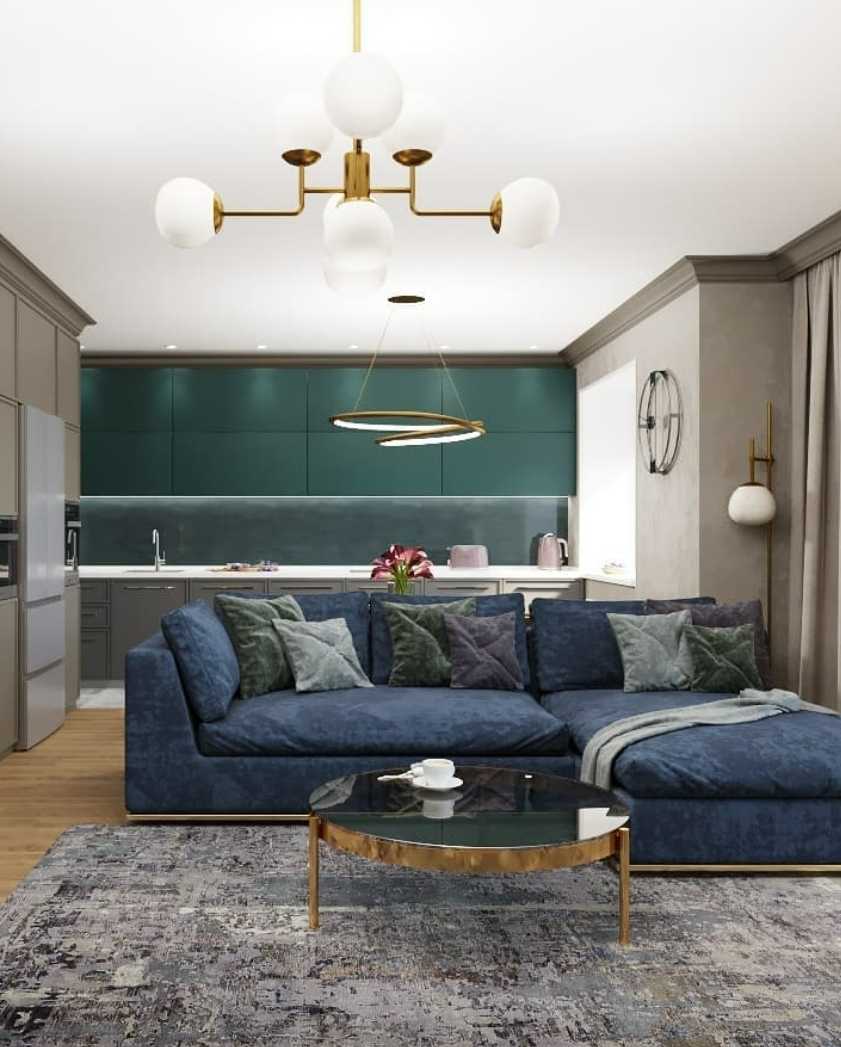 Серо-зеленый диван в интерьере гостиной