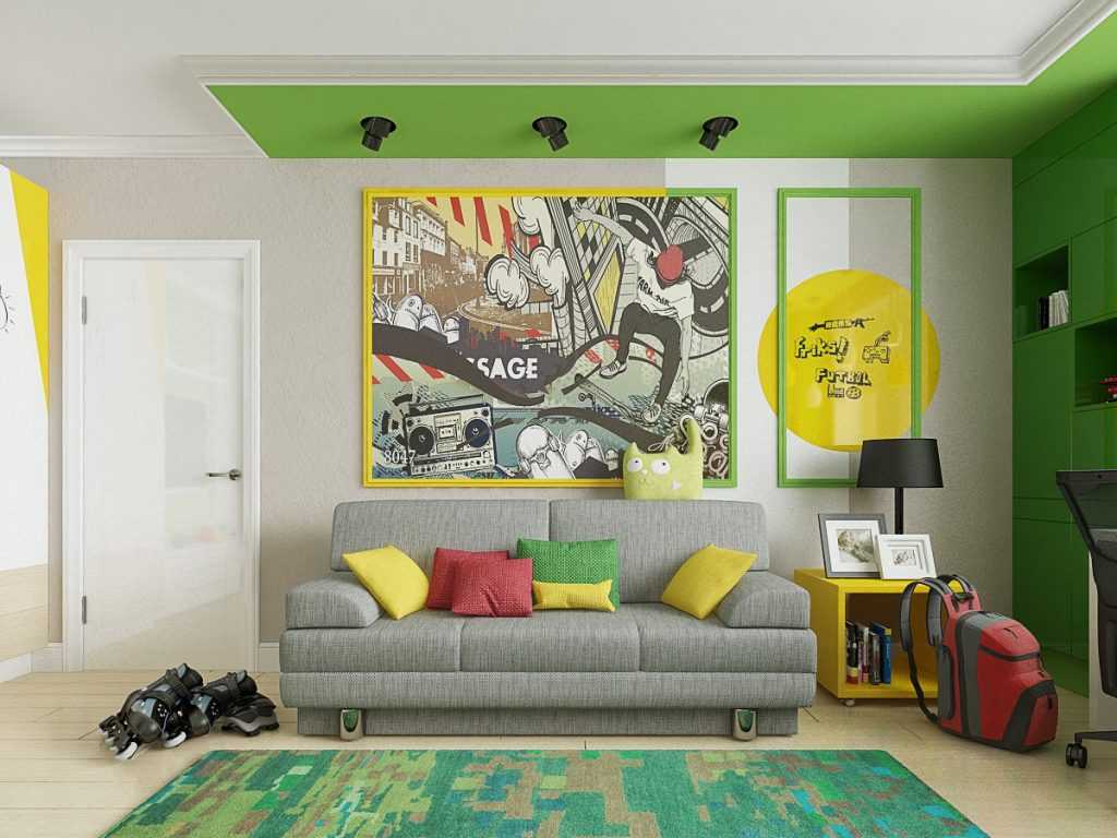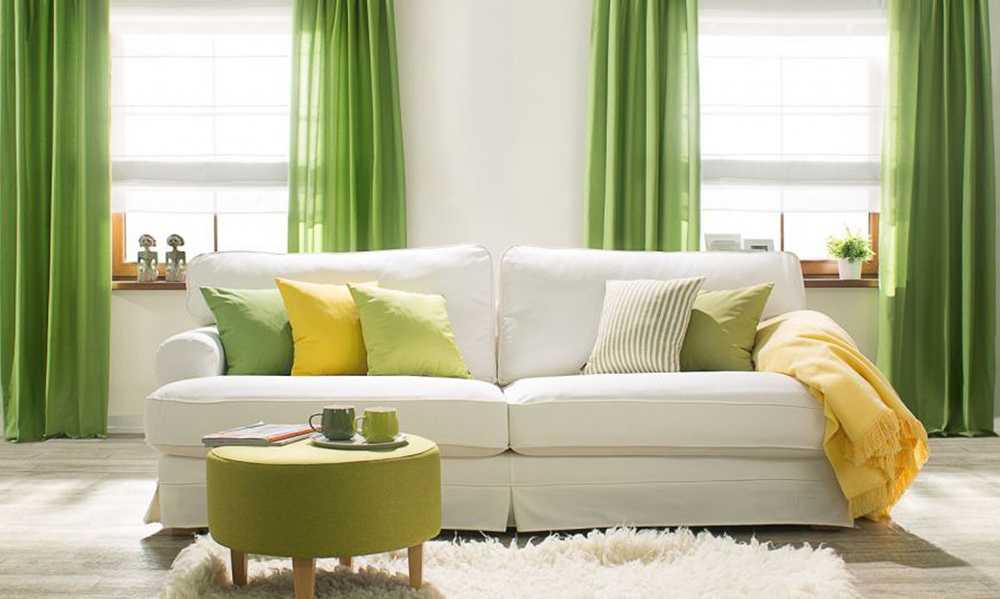 Лучше всего, когда основная мебель выбирается другим цветом, а аксессуары – подушки, покрывала дополняют материал зелено-желтым покрытием.