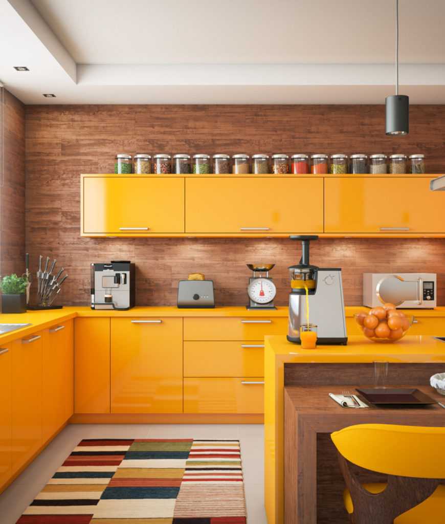 Оранжевые и желтые кухонные шкафы, настенная плитка, узоры обоев или декоративные аксессуары, такие как шторы, напольные коврики или абажуры – выглядят мягче, чем элементы дизайна и декора в красных тонах. Они дружелюбны и приятно теплые.