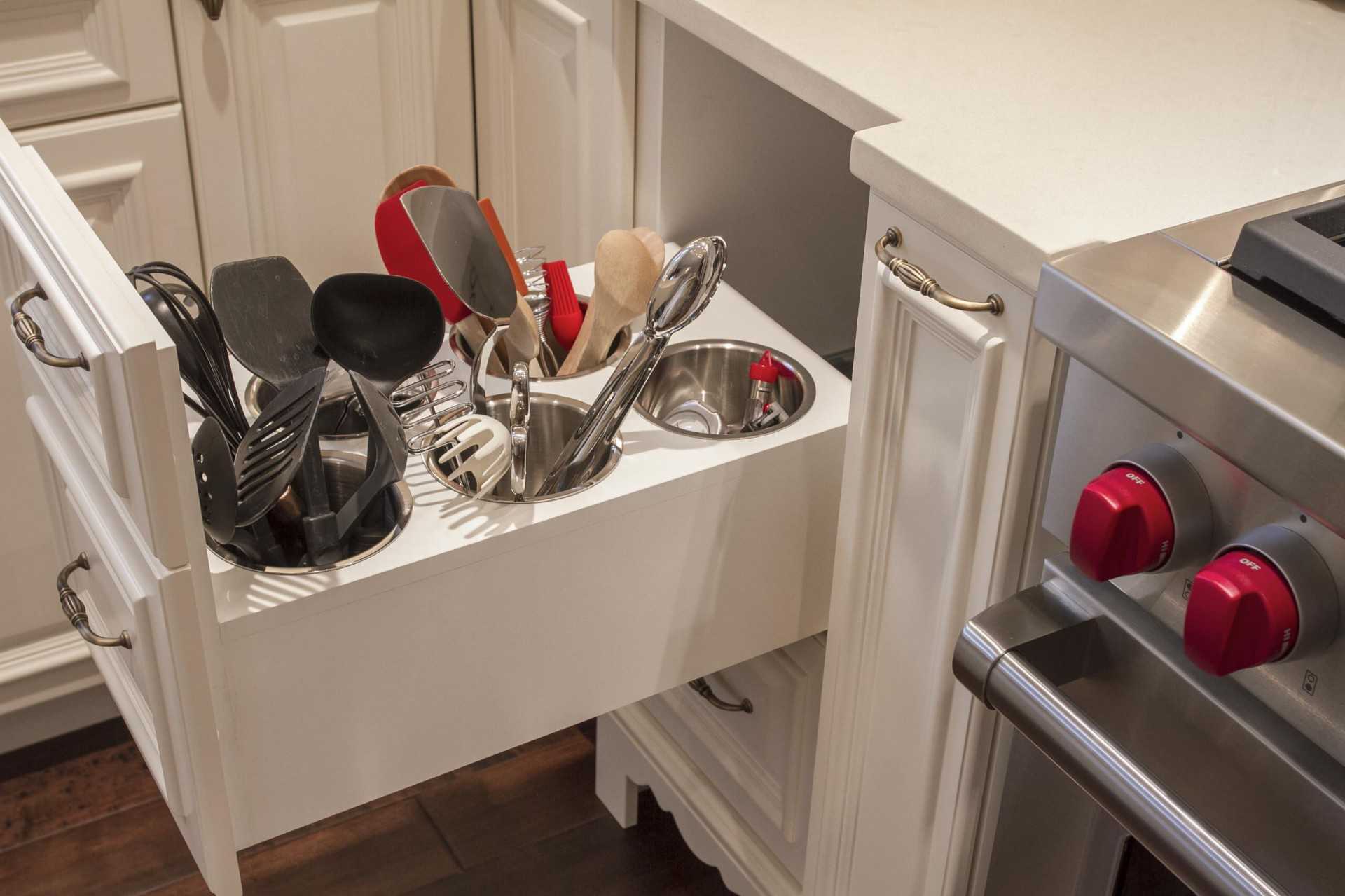 Рядом с раковиной непременно должна размещаться сушилка для бокалов и чашек, рядом с духовым шкафом – секция для противней, формочки для выпекания и другие кухонные атрибуты. Обязателен комплект ножей, досок для разделки продуктов. Даже сковородки должны располагаться отдельно и конечно, все остальные аксессуары, например, салфетки и декоративные свечи.