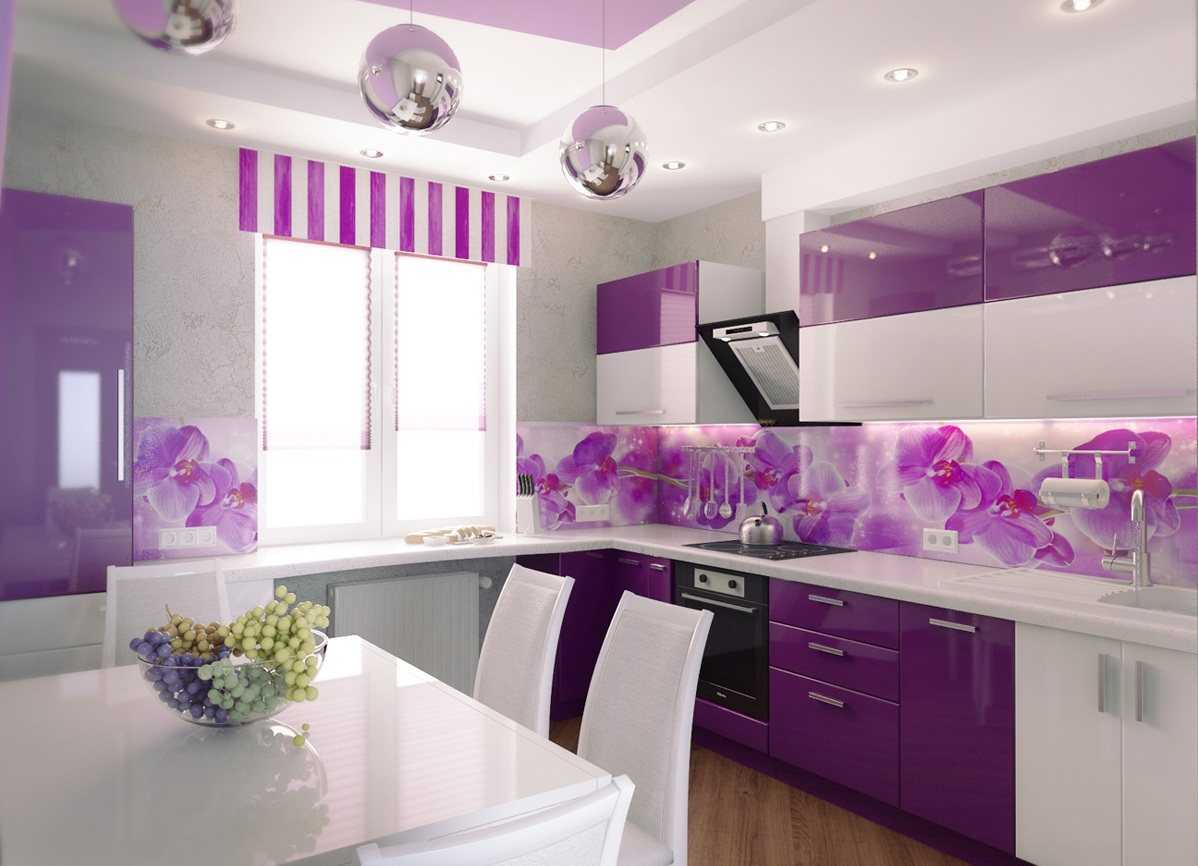 Кухонный гарнитур должен иметь максимально лаконичное исполнение без вычурных элементов декора. Для обеденного стола, стульев, столешницы или фартука, уместна сиреневая или пурпурная цветовая гамма.
