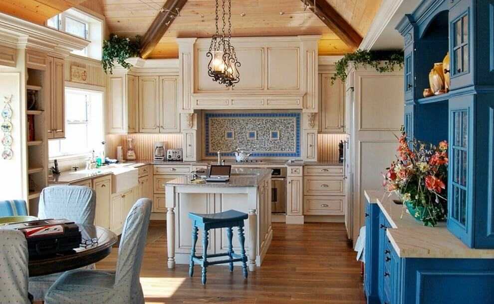 Прованс — одна из популярных этно-вариаций. Хорош для достаточно просторных помещений, в которых много света и воздуха. В интерьере подобной кухни приветствуется сочетание сиреневого и бежевого. Органично будет смотреться лавандовая столешница «под натуральный камень», оригинальный текстиль в тон, вазы с фиолетовыми цветами. Обои желательно выбирать матовые, слегка шероховатые, имитирующие природные материалы.