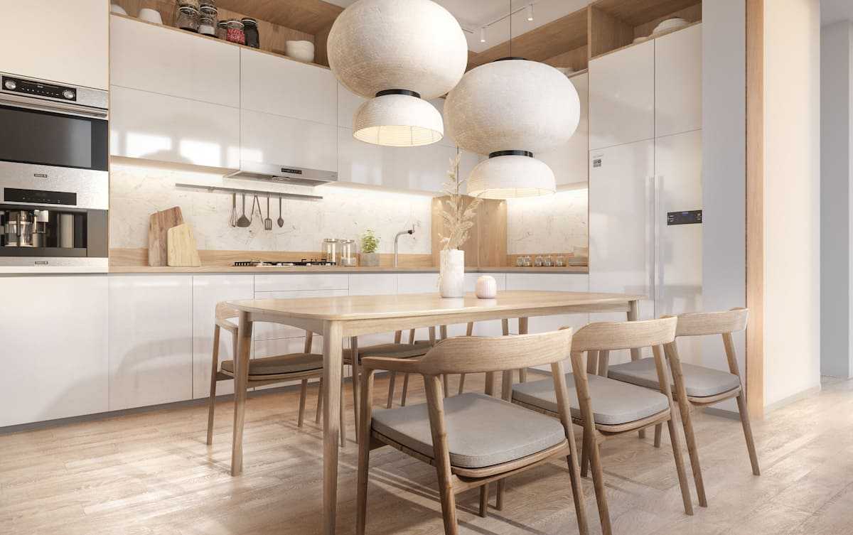 Для обеденной зоны, если она расположена достаточно далеко от плиты и мойки, можно выбрать деревянный паркет, натуральную доску или ламинат, но желательно с влагозащитной пропиткой. Независимо от размера помещения, рекомендуется остановиться на однотонном дизайне нейтральных белых, бежевых, светло-серых или древесных тонов.