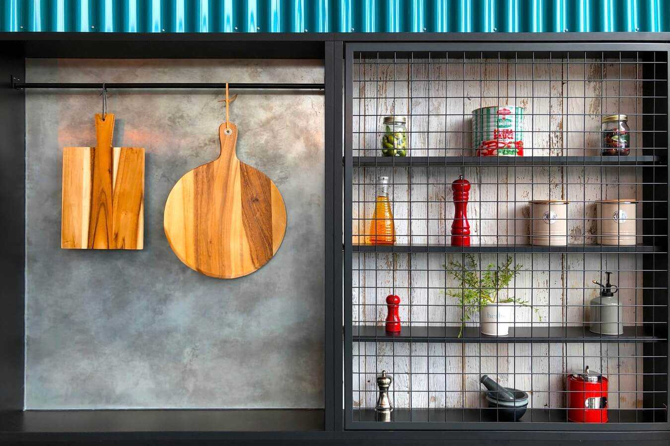 Кухня в стиле лофт с элементами коричневого и темно-бирюзового с бетонным потолкомИсточник design-homes.ru