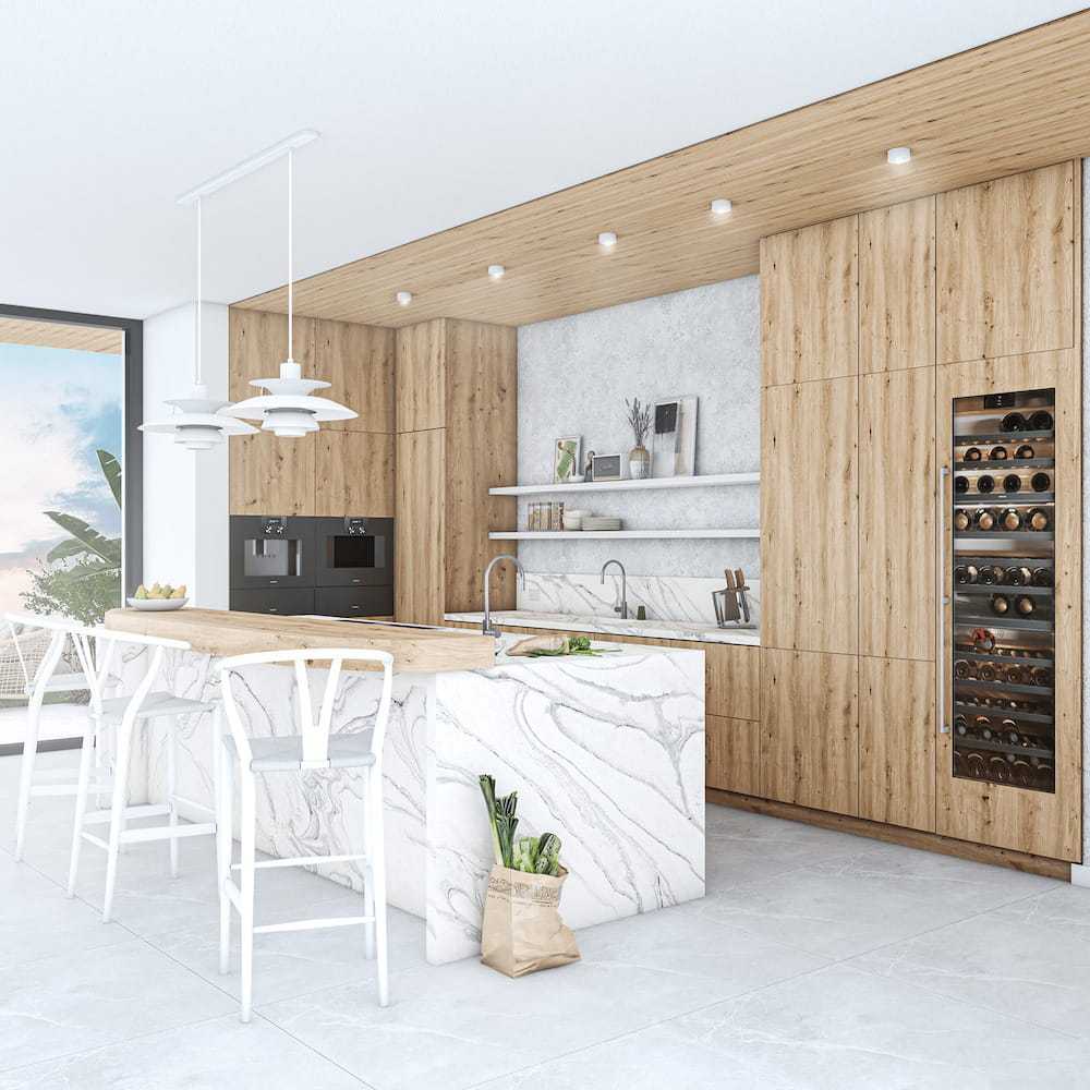 Важную роль в интерьере кухонного пространства играет остров, который стараются установить в центре и сделать композиционным центром. Массивный рабочий стол любят за его эргономичность и многофункциональность. Он представляет собой удобную рабочую поверхность с плитой и раковиной, местами для хранения, духовым шкафом. Нередко часть острова, обращённая к гостиной, оснащается барной стойкой, иногда – винным шкафом.