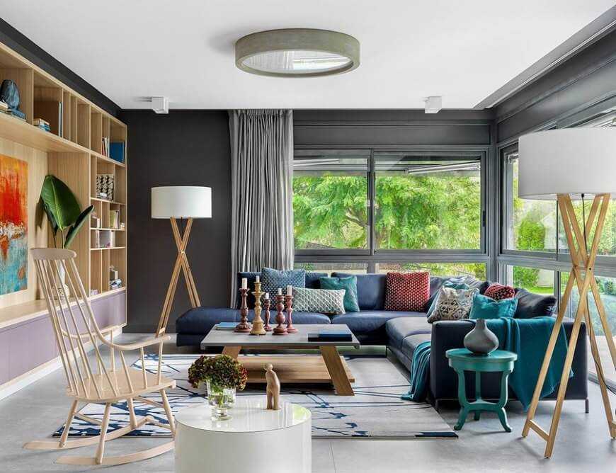 - Большие помещения, высокие потолки, окна с большими проемами, минимум мебели.