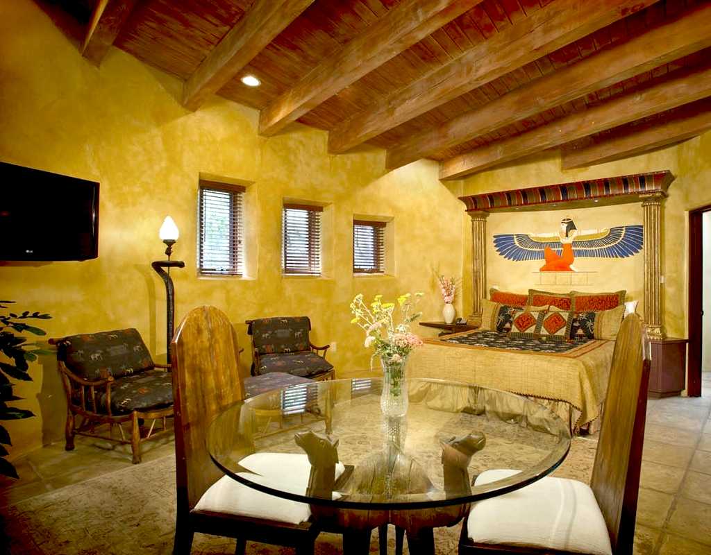 Если вы готовы к таким затратам, обратите внимание, что мебель в Египетском стиле должна быть темных тонов, желательно — из натуральной древесины. Приветствуется наличие сложной, витиеватой резьбы округлых форм
