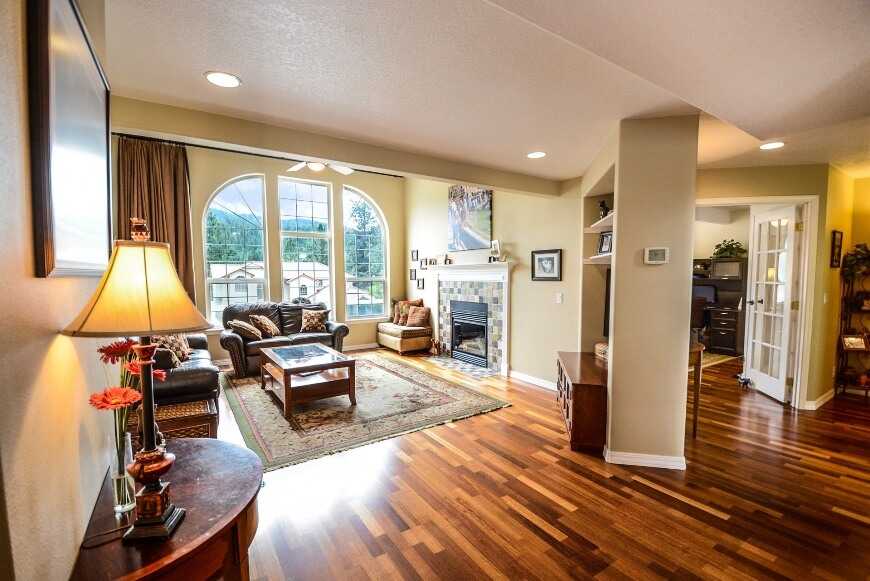 Можно постелить натуральную паркетную доску золотистого цвета или имитирующий древесную фактуру ламината.