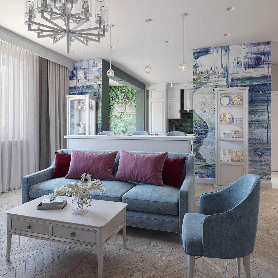 - Стены выполняются в одном цвете, чаще всего это холодные оттенки. При использовании обоев рисунок может быть графичным или с имитацией под натуральный камень.