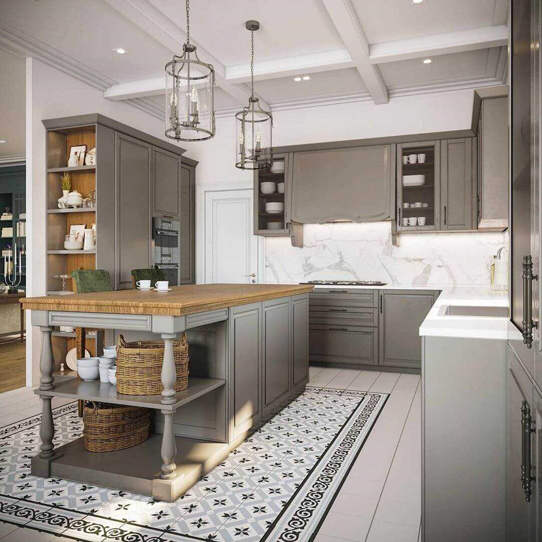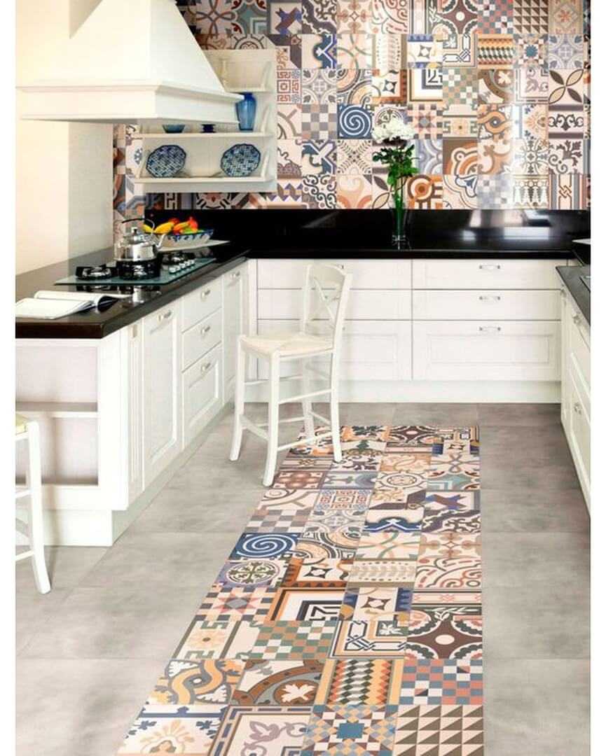 Напольное покрытие кухни, оформленной в средиземноморском стиле, может быть более яркое, контрастное. На фото интерьеров отлично смотрятся импровизированные коврики из плитки с восточным орнаментом, выложенные в обеденной зоне.
