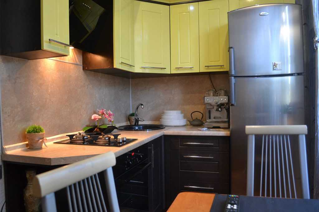 Одним из удачных вариантов будет лимонная мебель на бежевом фоне вместе с зеленым фартуком, стульями и шторами.