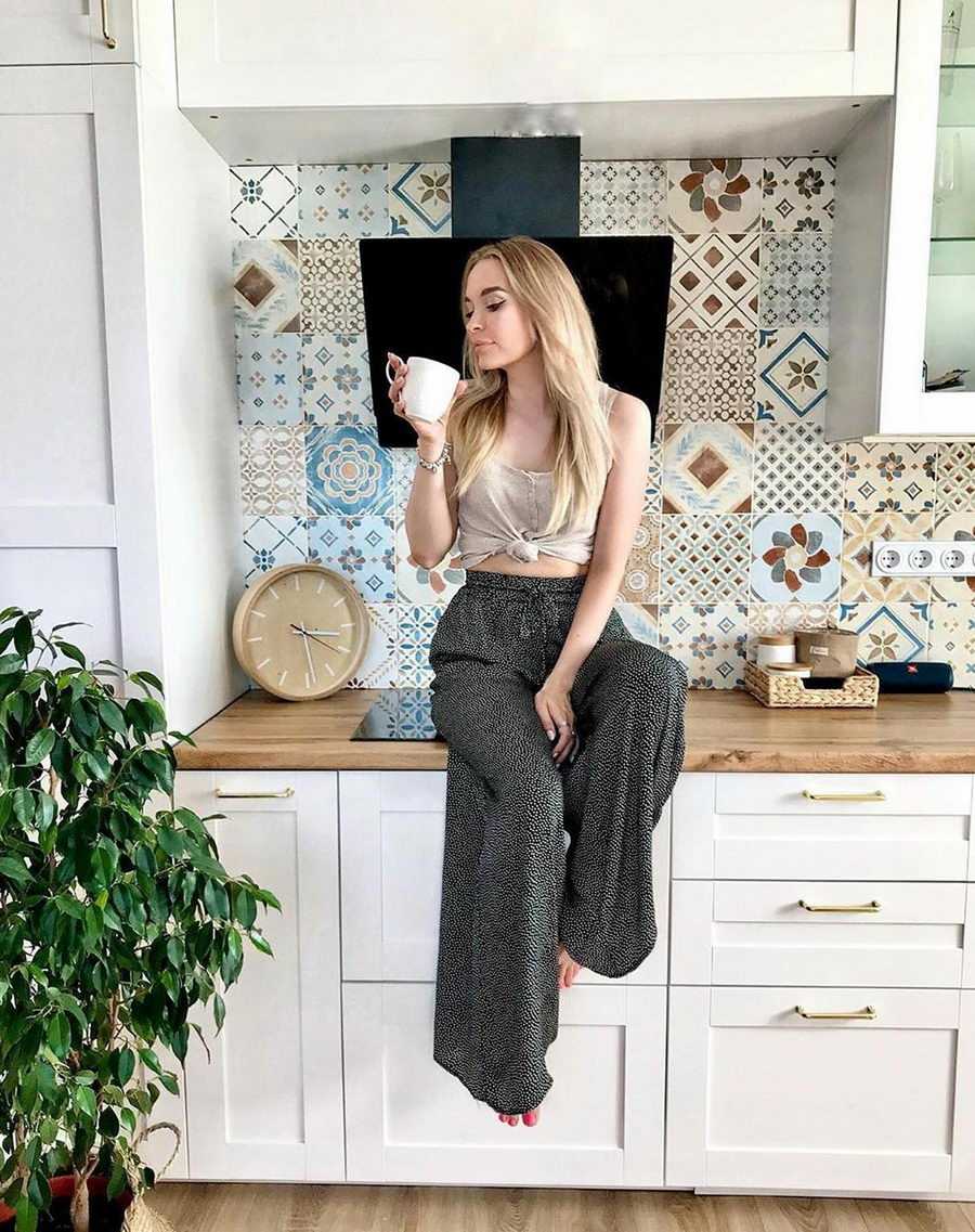 А чтобы добавить солнечности, его можно сочетать с желтым цветом. Это могут какие-то желтые акценты в виде декора или посуды, возможно, фартук и т.д.