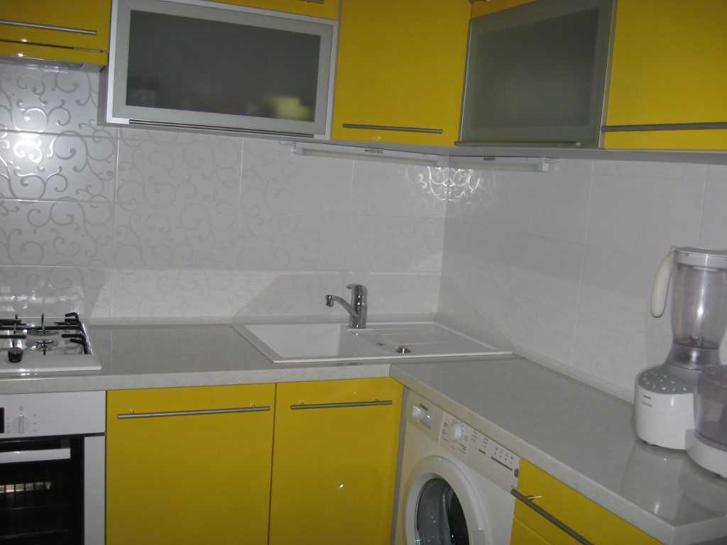 В целях соблюдения гармонии цвета покройте лишь часть стены желтой краской или плиткой, остальную поверхность лучше оставить белой. Если подобранный гарнитур отличается яркостью, окружите его приятным и теплым молочным, кремовым тоном. В компании с пепельными голубыми, серыми и бежевыми красками солнечный цвет будет выглядеть нежно и сдержанно.