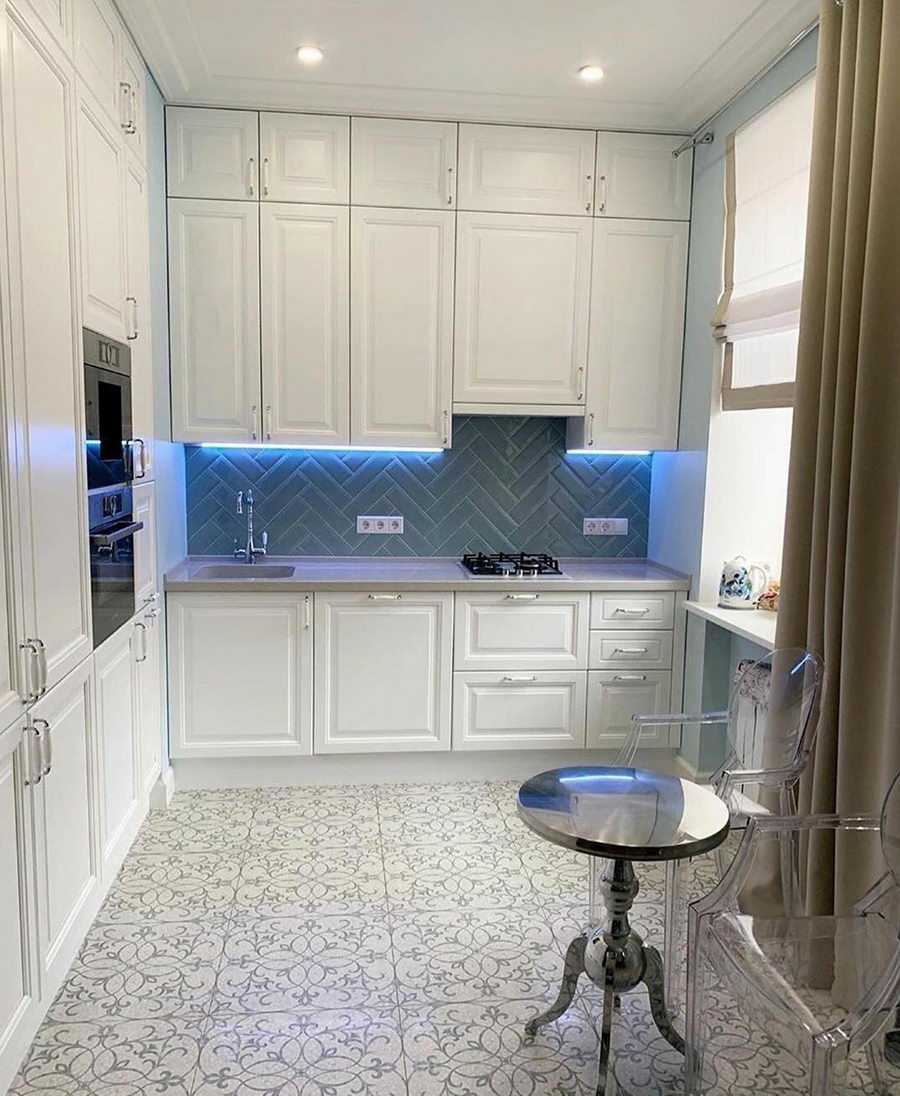 Акцентом на белой кухне может стать оригинальное оформление окна выразительными римскими шторами либо занавесками с растительными мотивами. Очень красиво будет смотреться керамический фартук в ярком обрамлении.