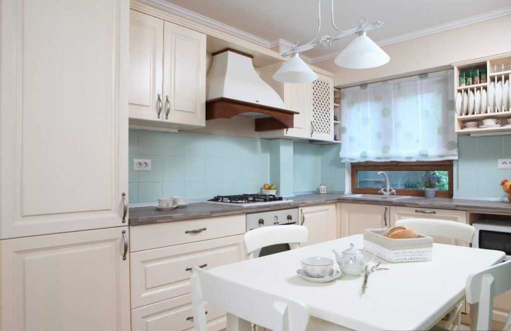 Кухню в средиземноморском стиле не обязательно выполнять только в белом и синем цвете. Нежный зеленый в сочетании с бежевым – тоже неплохое решение.