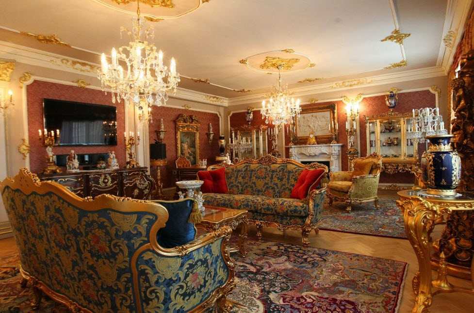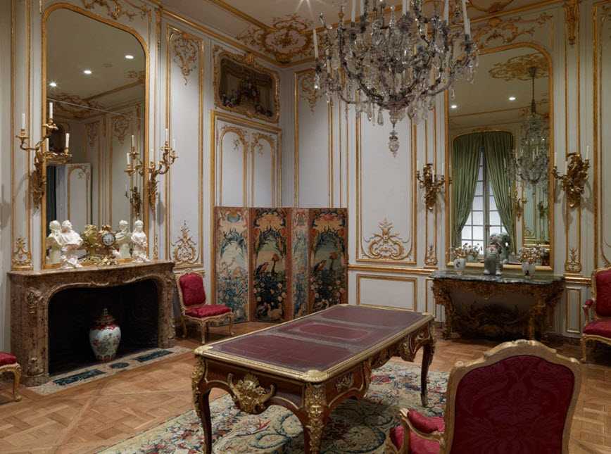 - Применение дорогих отделочных материалов.В оформлении используется мрамор, каменная мозаика, ценные породы дерева, везде присутствует позолота, слоновая кость, недешевые ткани.