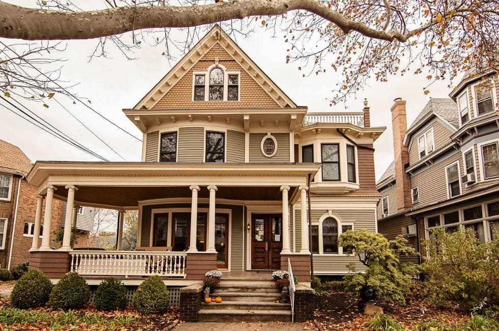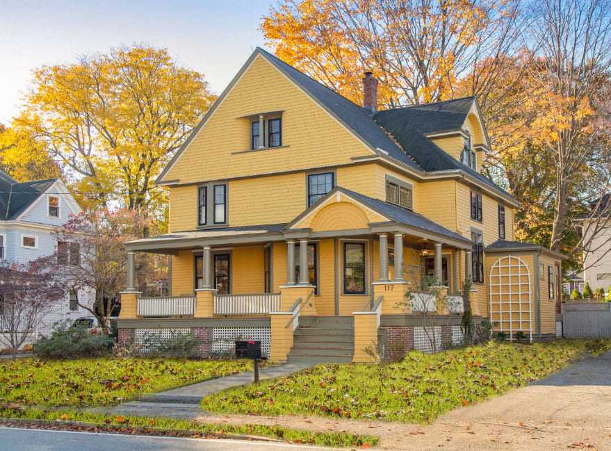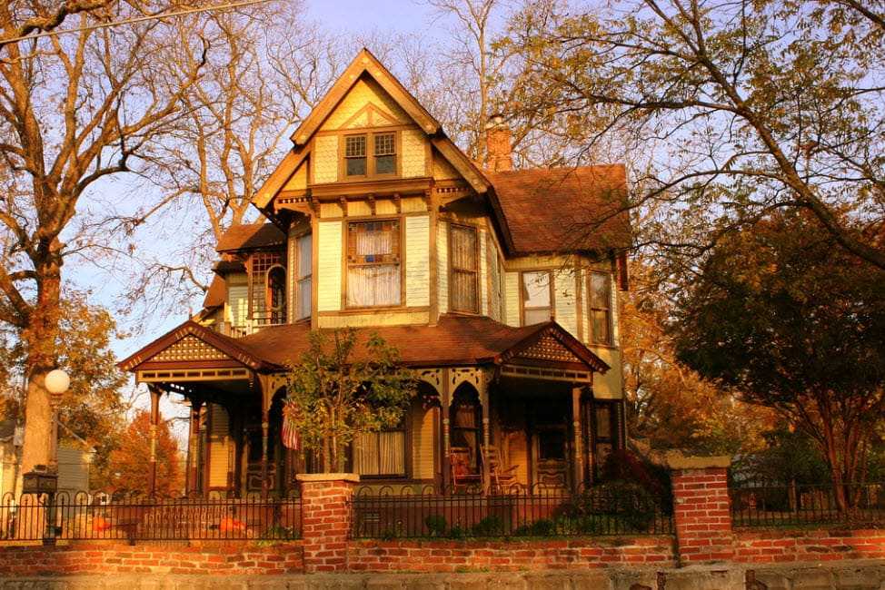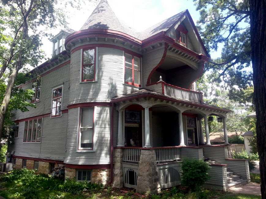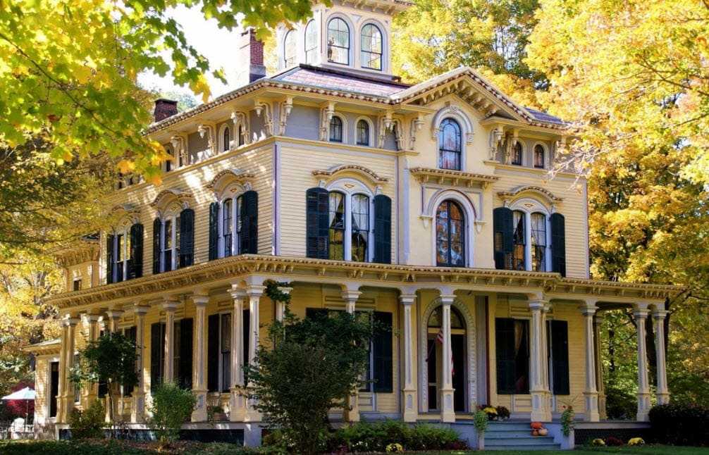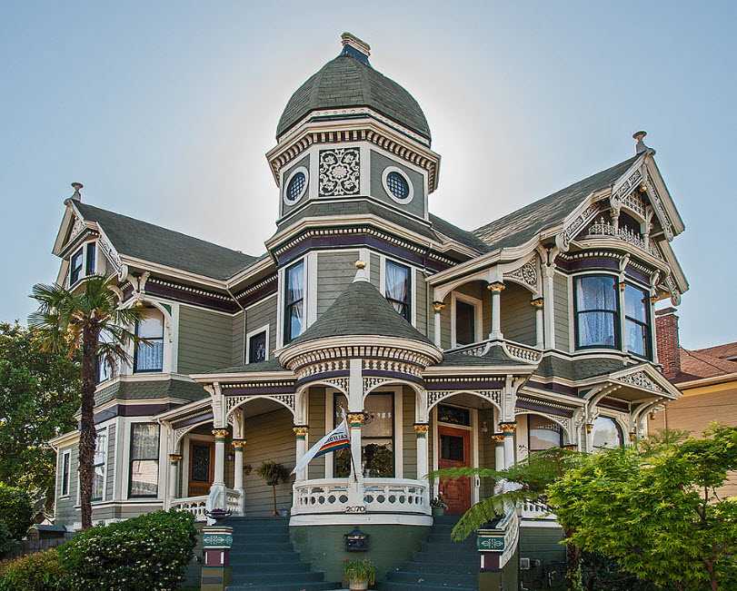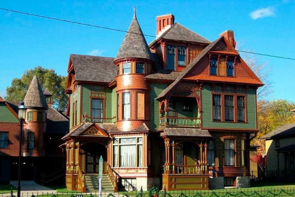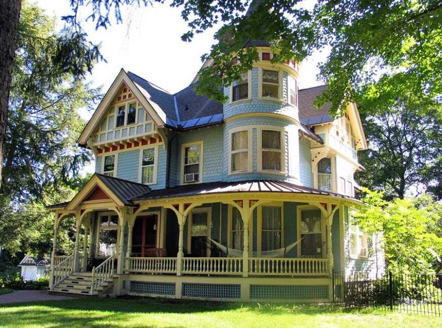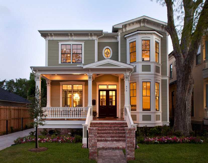 Окна прямоугольные или полуциркульные, дверные проемы арочной формы с колоннами, устремлены вверх. Рамы изготавливаются из натурального дерева, лакируются и инкрустируются.