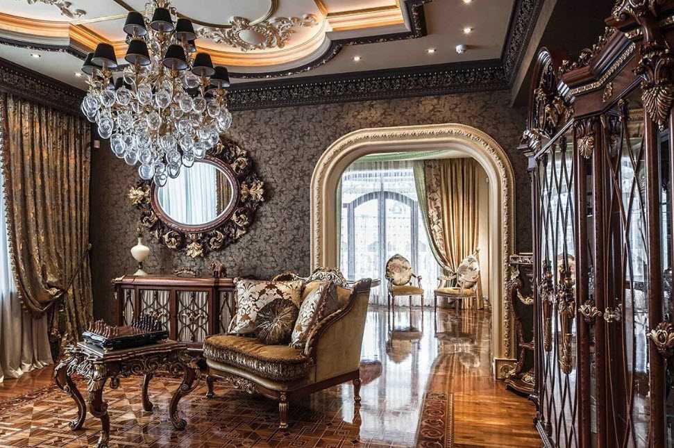 Внутреннее пространство дома в стиле барокко невозможно представить без натуральной древесины, обилия зеркал и дорогостоящего текстиля. Каждый элемент, находящийся в комнате, должен иметь оригинальную отделку, например, зеркала украшают позолоченными ажурными рамками. Те же требования выдвигаются и к портьерам, коврам и прочим деталям.