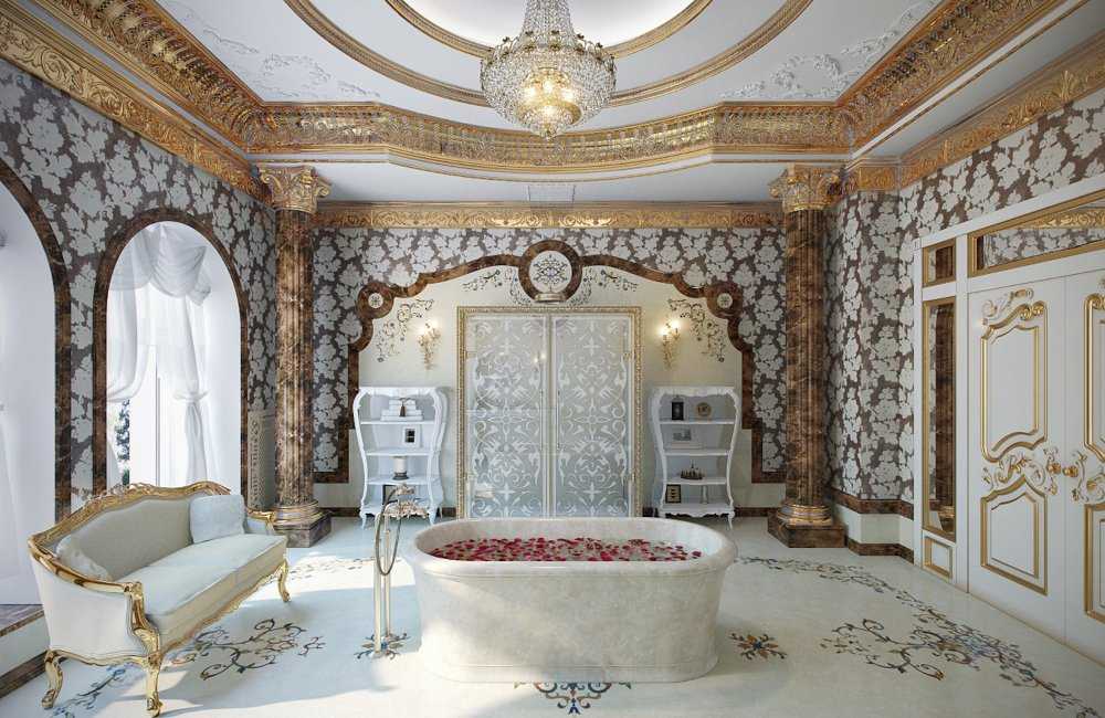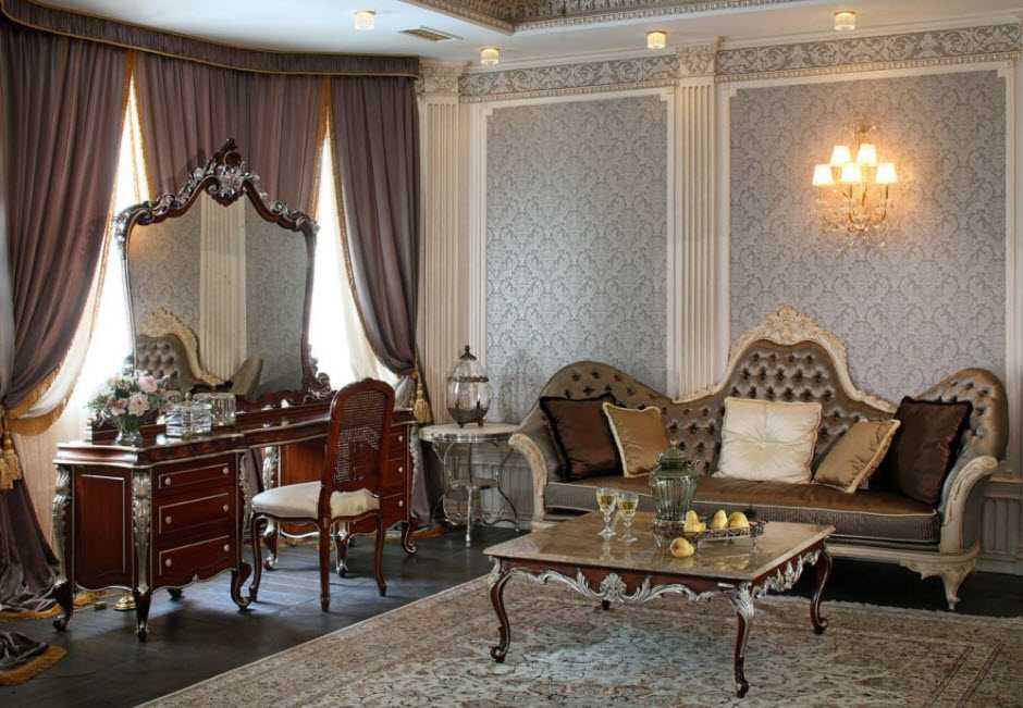 При планировке закладываются большие оконные и дверные проемы, ниши для фигурных статуй и вазонов, учитывается расположение зеркал и гобеленов на стенах.
