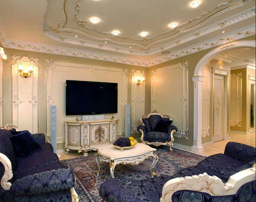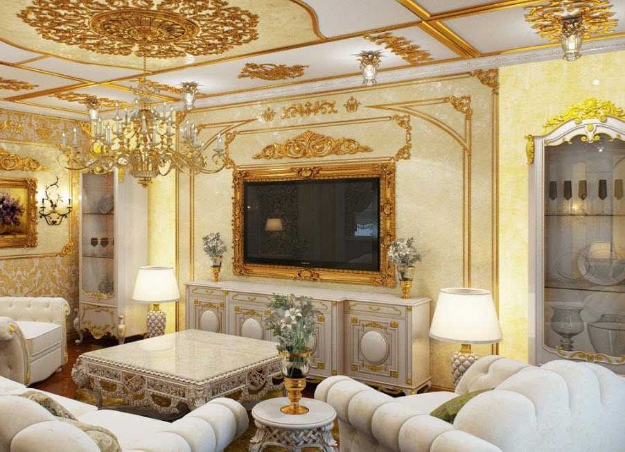Поэтому тут допускается использовать двухуровневую конструкцию из гипса со встроенными точечными светильниками, но стоит позаботится об «озолочении» источников света, например, позолоченными накладками.