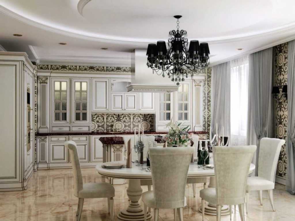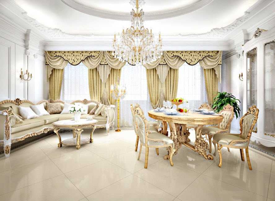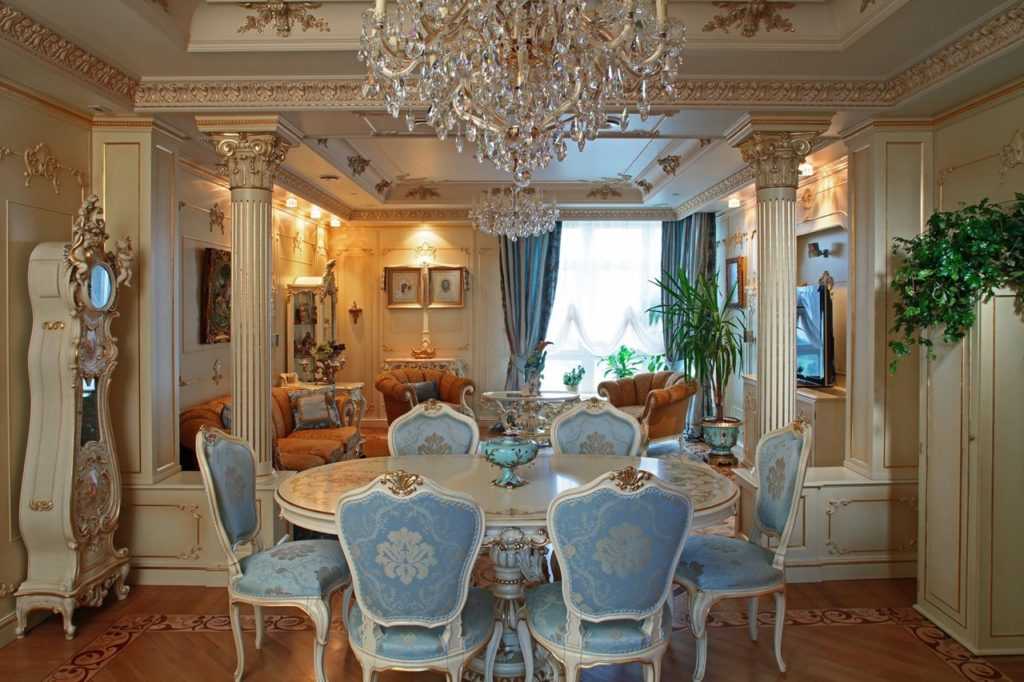 И последний важный элемент, без которого не сможет обойтись ни одно помещение в царском стиле — люстра. Большая, золотая, ажурная и яркая люстра с элементами хрусталя должна занимать центральное место в обеденной зоне.
