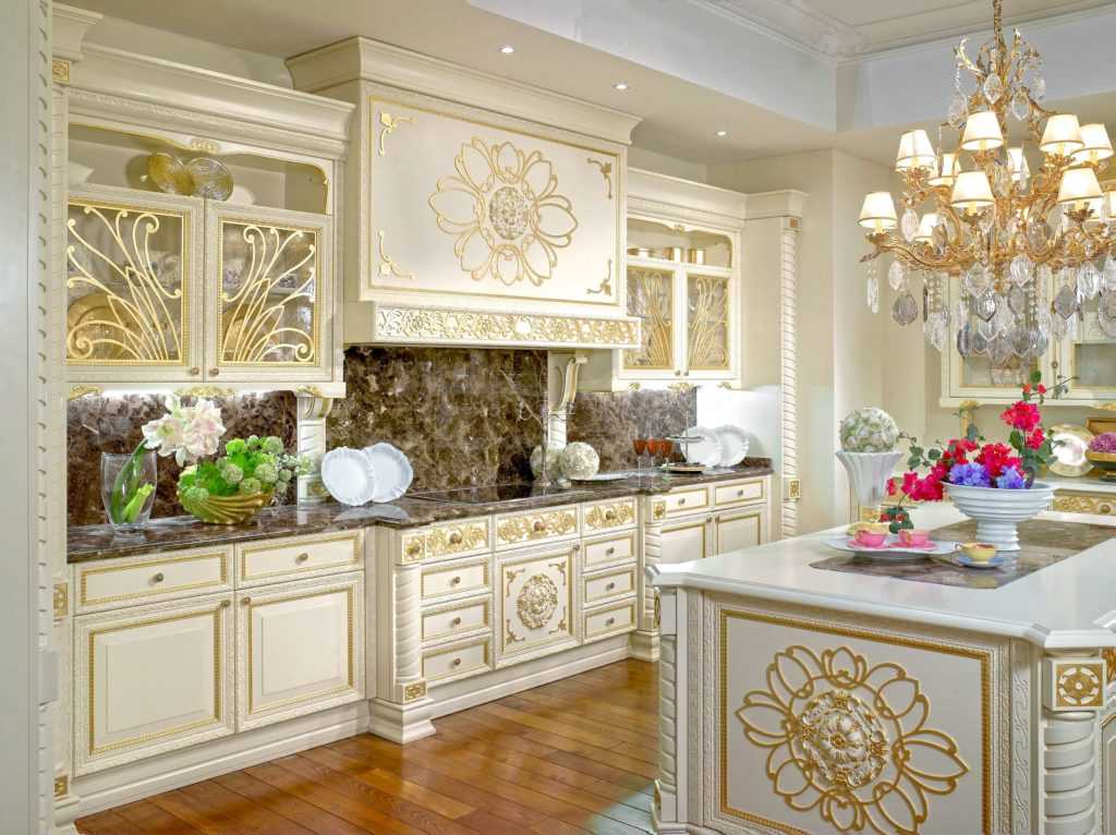 Барокко не приемлет прямых линий. Кухонный гарнитур в этом стиле отличается дверцами с изгибами. Каждый предмет интерьера имеет извилистые элементы. Ножки столов и стульев украшают золотой лепниной. На мебели обычно вырезают следующие изображения: