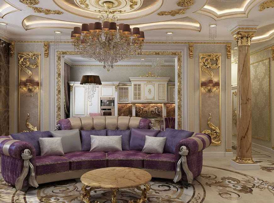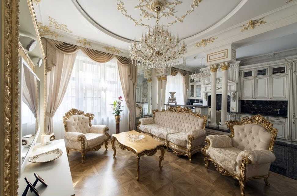 Главный элемент гостиной – камин (желательно настоящий), украшенный лепниной и мраморной отделкой. Живой огонь не только дарит тепло, но и создает красивую картинку, внося в интерьер чувство уюта и комфорта. Стоит отметить, что грамотно оформить внутреннее пространство своими силами не получится, лучше пригласить дизайнера, способного соблюдать пропорции. Жилье не должно быть наляпистым, но и брак в декоре сделает его пустым, незавершенным.