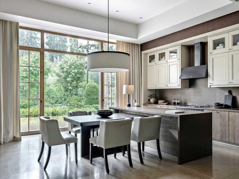 Набирающее популярность решение, совмещения с жилой комнатой. Создаётся психологический комфорт, обусловленный возможностью беспрепятственного общения между членами семьи. Лишённое чётких границ помещение способствует поднятию настроения. Обеденная зона гармонично вписывается в общее видение.