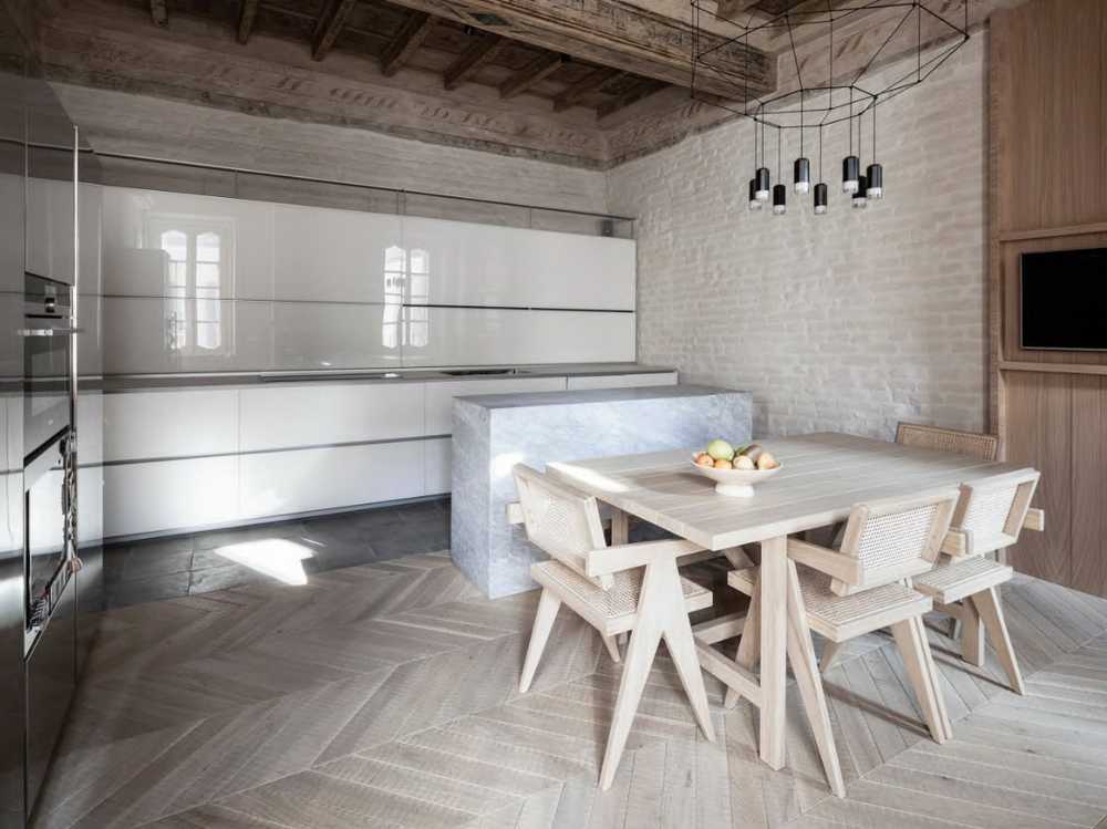 В любом случае — лампы, висящие над рабочей поверхностью, островом или большим столом, также являются сильным акцентом. Это украшение, которое в сочетании с отсутствием верхних шкафов означает, что сначала этот интерьер не воспринимается как кухня.