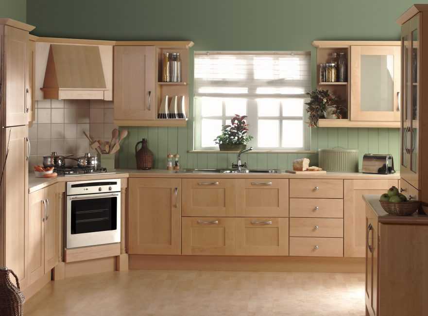 - Гарнитур. Подобная меблировка должна быть удобная, практичная и иметь много места для хранения различных кухонных приборов. Лучшей моделью в данном случае будет гарнитур с дверцами. Красивую посуду и сервизы можно разместить на открытых полочках или купить дополнительно витрину. Располагают гарнитур обычно около одной стены. Удобнее всего ставить конструкцию П- или Г-образной формы. Если площадь жилой территории большая, то в центре кухонной комнаты располагают островок с рабочим местом и шкафами под посуду, расположенными снизу. Подобный модуль чаще всего дополняется обеденным столом.