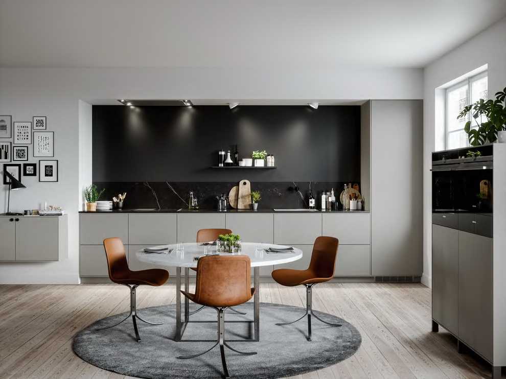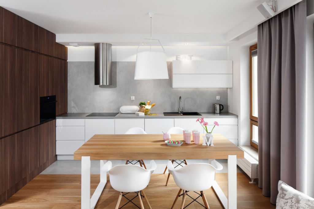 Элегантно смотрится бело-черная палитра в классическом исполнении. Такой дизайн обычно использует стильные оттенки, благодаря чему контраст получается более мягким. Белый цвет может быть приглушенным – сливочным или слоновой кости. А вот черный имеет еще больше вариаций: от матового черного до темно-серого с фактурой камня. Именно такие покрытия обычно выбирают для отделки пола и фартука. Серой может быть мебель в гостиной, но исключительно с дорогой обивкой – велюр или бархат. Гарнитур обычно выбирают белый – со светлыми фасадами.