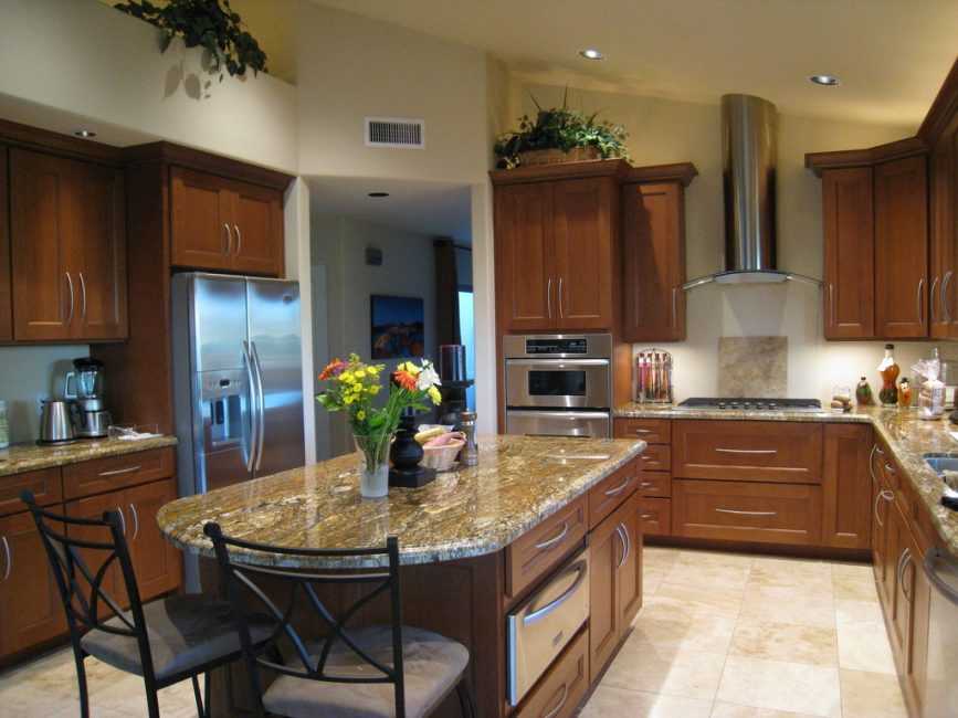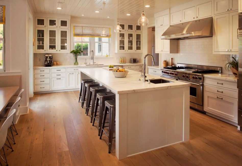 Частный дом – вот где можно дать волю своей фантазии. Большая кухня студия-мечта любой хозяйки. Широкий обеденный стол, за которым легко поместится вся семья. Разнообразие подвесных шкафов, в которые можно поместить все необходимое для кухни. Большая варочная поверхность, на которой можно готовить сразу несколько любимых блюд. Наличие окон в кухне придаст уют. И чем больше их, тем лучше.