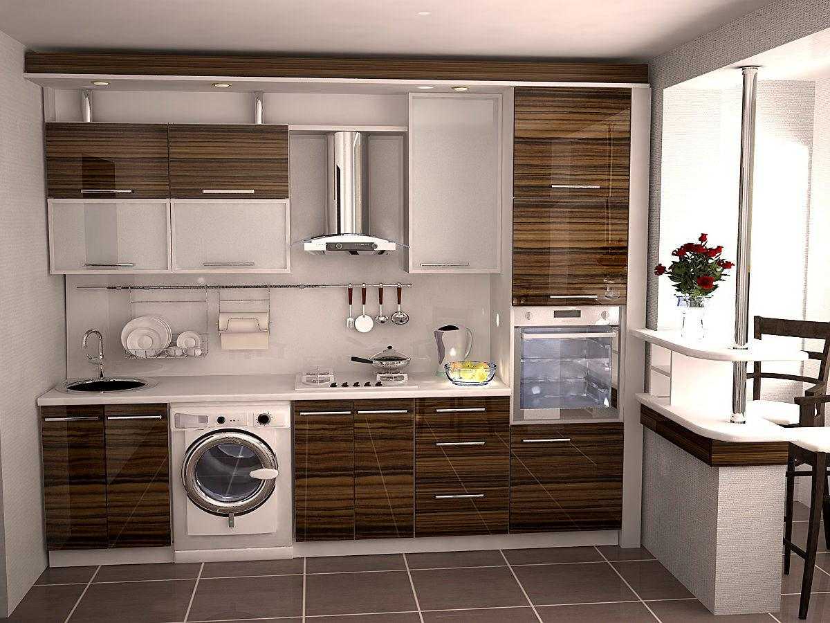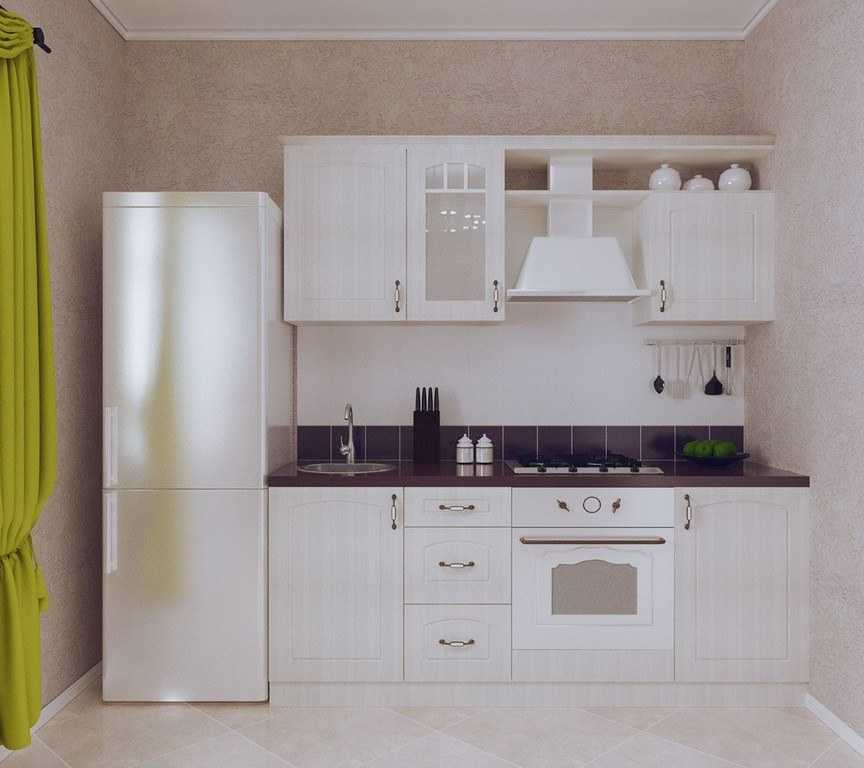 Для маленькой кухни размером около пяти метров в квадрате, будет актуальна линейная планировка. Удобнее будет рабочую зону формировать в указанном порядке: холодильник, раковина, зона приготовления и духовой шкаф.