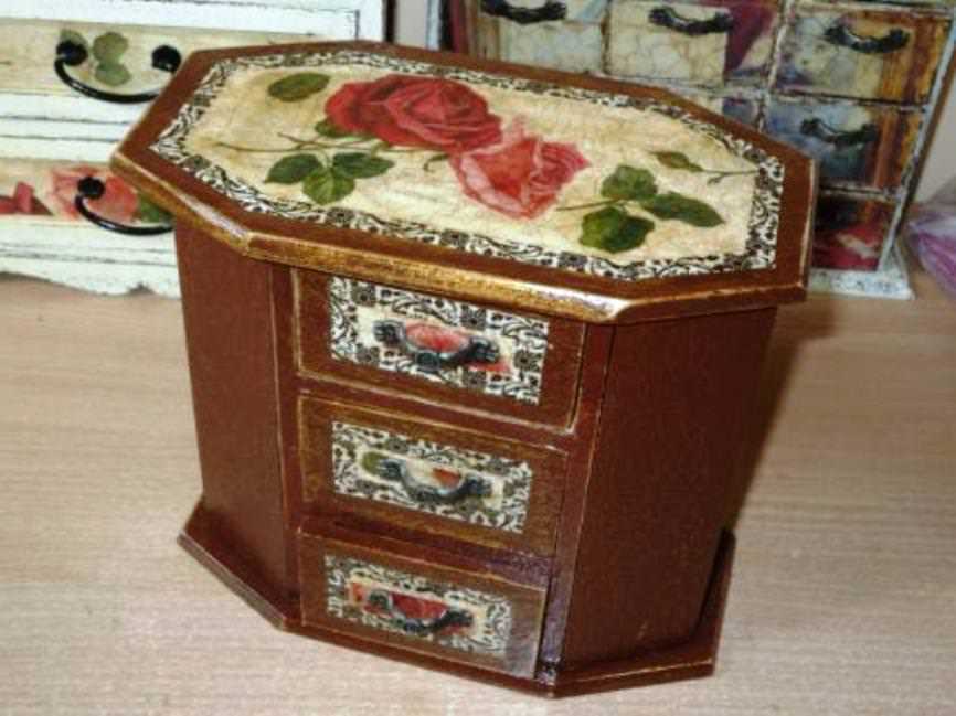 Вырезанные мотивы рисунка приклеиваются клеем ПВА и выравниваются. Когда клей высохнет, не спешите заканчивать декупаж комода. Нанесите на верх тумбочки и ящики кракелюр. Просушите его и нанесите вторую его фазу. Опять сушим и ждем, когда появятся трещинки. После того, как они образовались, затрите их битумом. Можно считать, что комод в стиле винтаж готов.