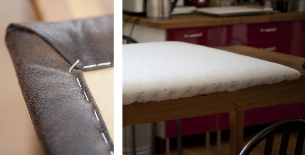 Отрежьте необходимый кусочек обивки, приложите его так, чтобы края заходили на место, где заканчивается старая, и прикрепите при помощи степлера. Вы можете провести такие манипуляции как с мягкой частью, так со спинкой и быльцами.