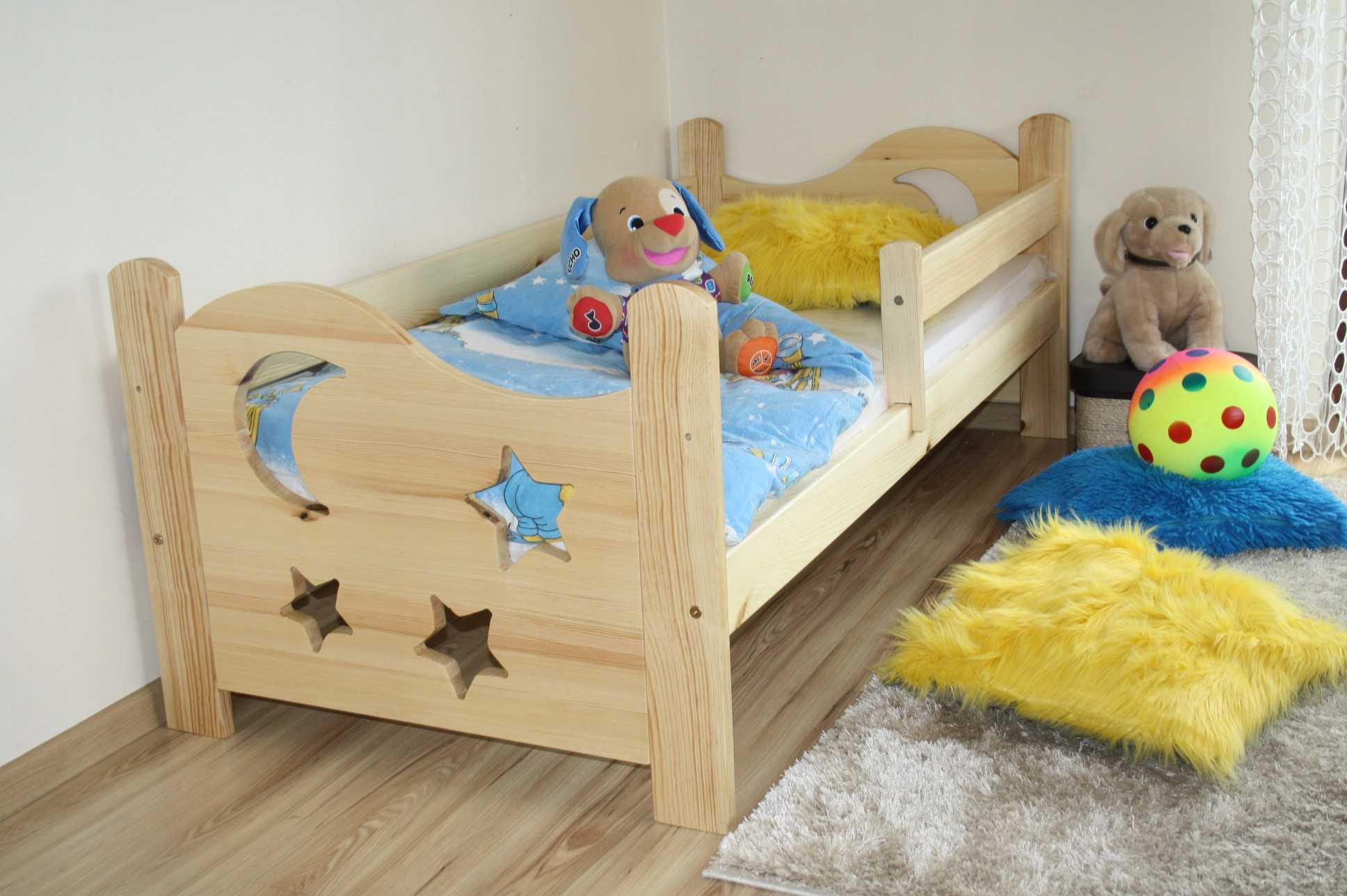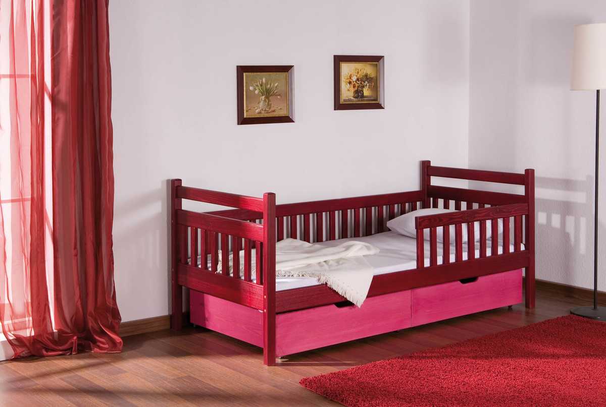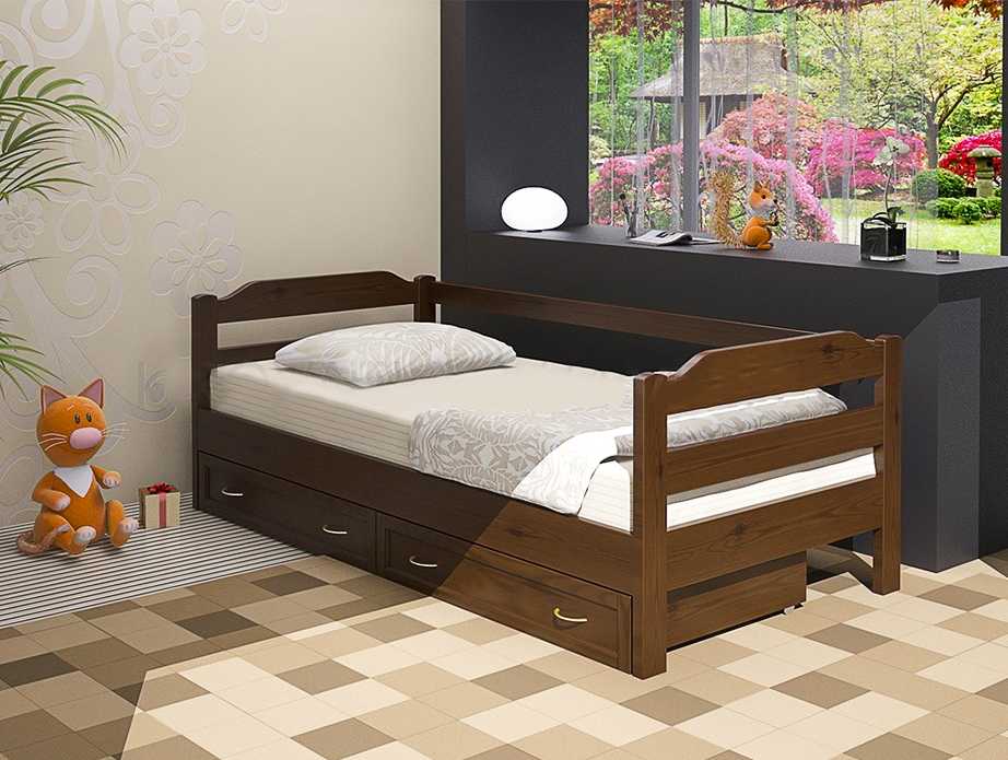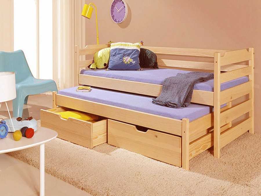 Экологически чистой и не выделяющей вредных соединений считается мебель из массива сосны. Из хвойных пород часто изготавливаются кровати для детей, которые отличаются длительным сроком эксплуатации. Изделие имеет надежный каркас и закругленные углы.