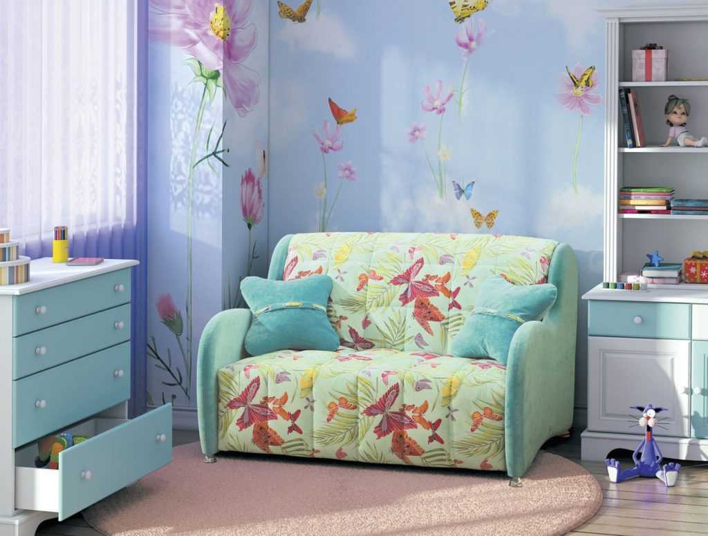 Диваны для детских комнат как правило обтягиваются яркими, но в тоже время практичными материалами из которых легко выводить пятна.