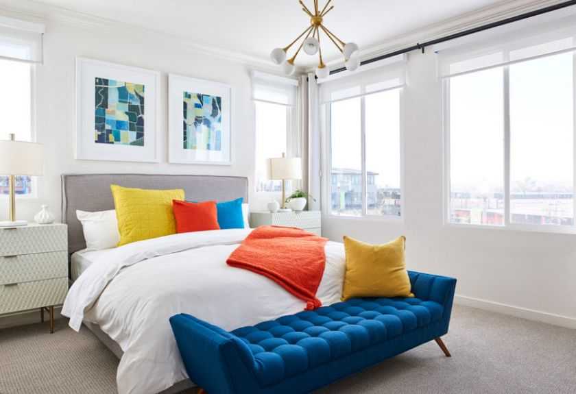 - При контрастном варианте спинка кровати отчетливо противопоставляется стене и делает акцент на ее размере и форме.