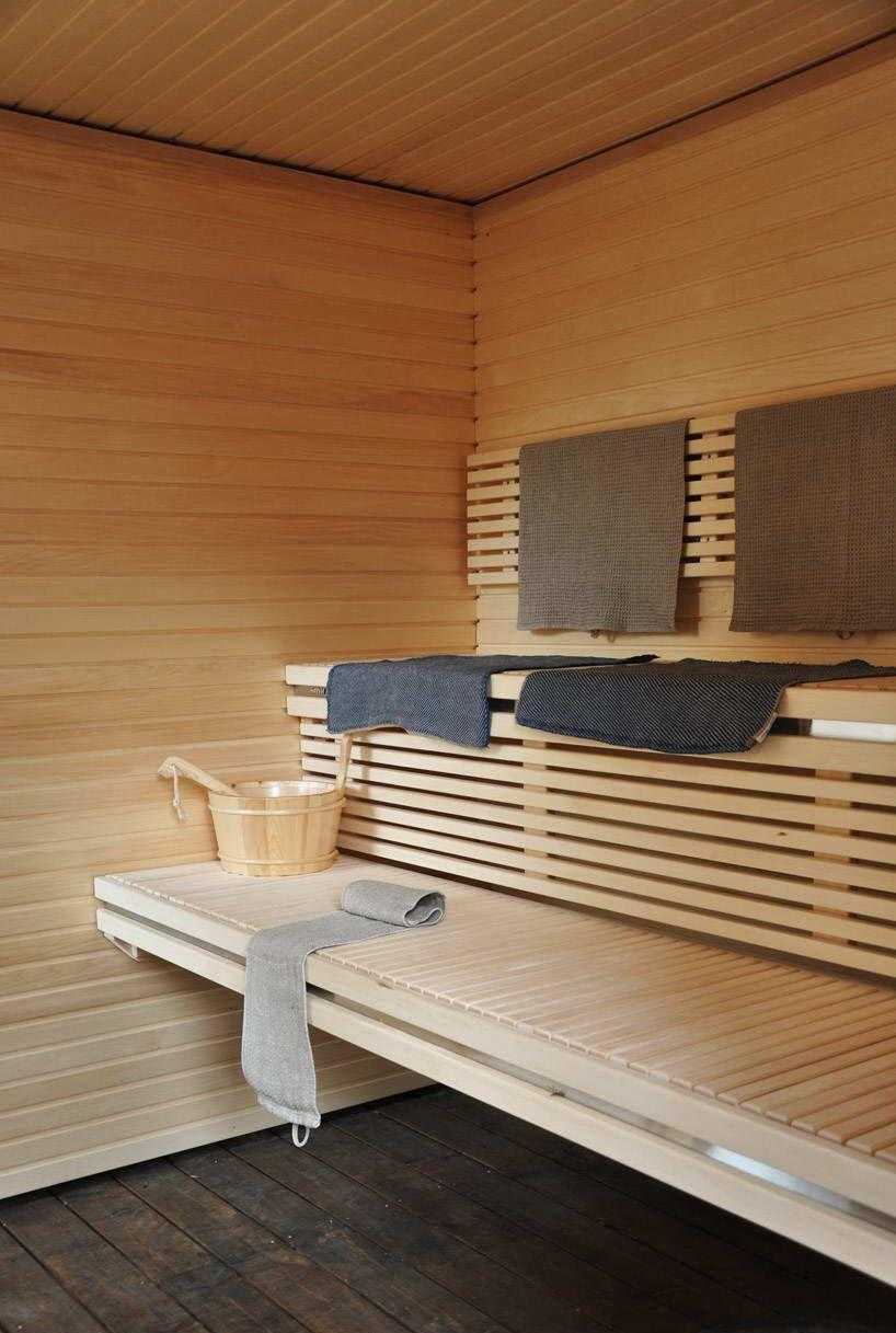 - Лежаки. Обычно размещают в несколько ярусов, чтобы те, кто любит побольше жара, могли забраться наверх, а те, кто хочет отдохнуть, могли посидеть внизу.