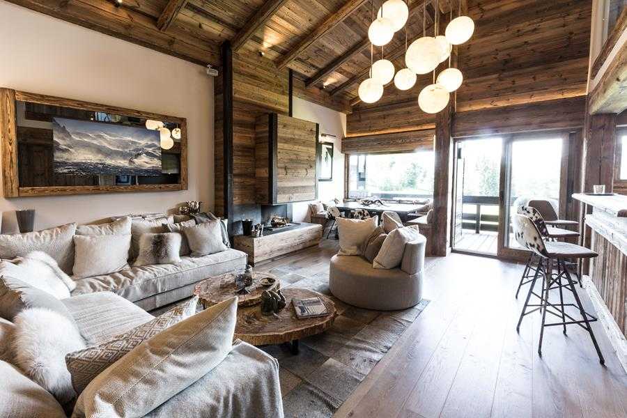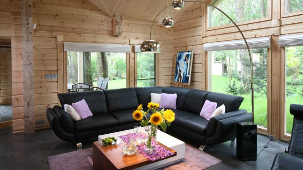 Можно сочетать ровное, обработанное бревно с современными и стильными предметами мебели, что позволит создать изысканный и неповторимый интерьер в доме.