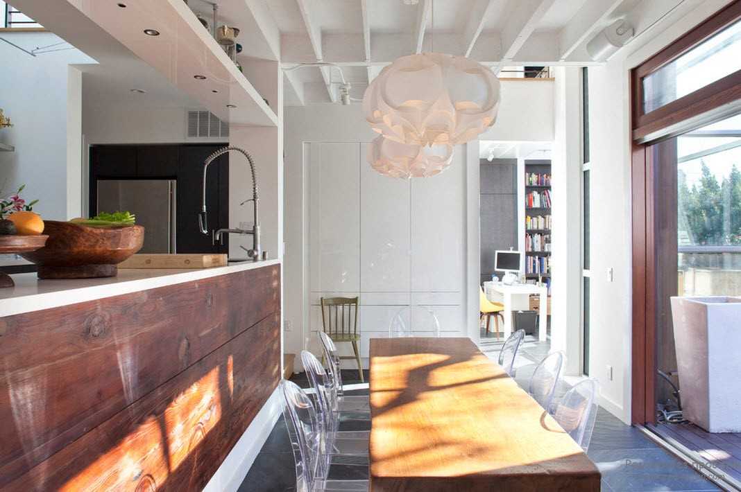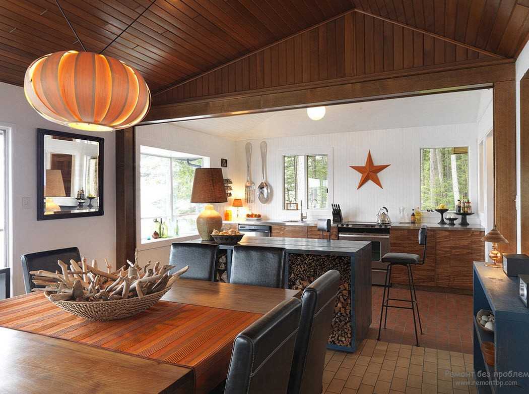 Кухни, столовые – это зоны, где человек получает удовольствие от пищи, отдыха и общения в семейном кругу. Именно здесь, как нигде, хочется наполнить интерьер атмосферой уюта, тепла и гармонии. Дерево – единственный материал, который идеально справиться с поставленной задачей. Причем его можно использовать совершенно по-разному.