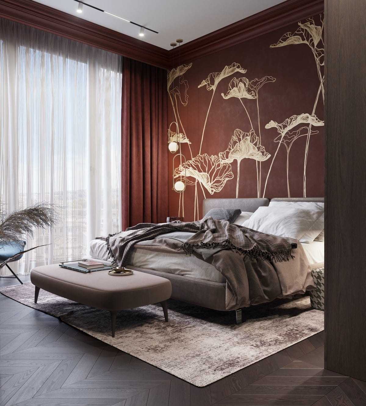 Красный. Да, красный тоже имеет место быть в классическом стиле. Подходит любой оттенок от бордового до терракотового. С такими тонами спальня выглядит роскошно, с нотками романтики, атмосферности. Чтобы красный не выглядел агрессивно, рекомендуется уравновесить его мебелью спокойных оттенков (подойдут как светлые, так и темные).